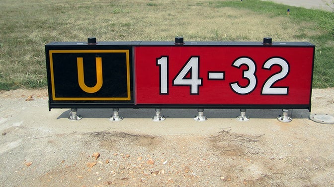The sign above is a different version and with an important distinction. Notice the black square with a yellow letter. (This is a taxiway location sign; same as above.) Here it is coupled with the red sign with white letters which gives an indication to a pilot to be more alert. That's because the pilot is approaching the intersection of runway. This is a holding position sign which requires specific ground clearance for the pilot to proceed. (There are additional markings on the ground, but that's beyond the scope the article and you can't easily see them as a passenger.) Ground controllers will have airplanes cross runways. Inadvertently crossing a runway without clearance while taxiing is a major safety concern in aviation. In this case, Runway 14's approach end is to the left and Runway 32's approach end is to the right.