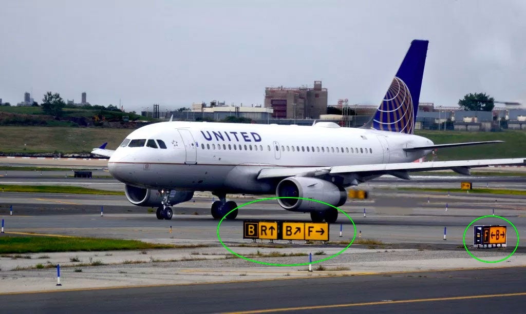 On your next flight, you might spend 25 minutes or more taxiing to the runway. Take a look out the window and you'll spot a variety of signs — some indicating the runway you're headed to. They're designed primarily for pilots, but you can follow along by understanding how they work and comparing what you see out the window to the freely available airport diagram.