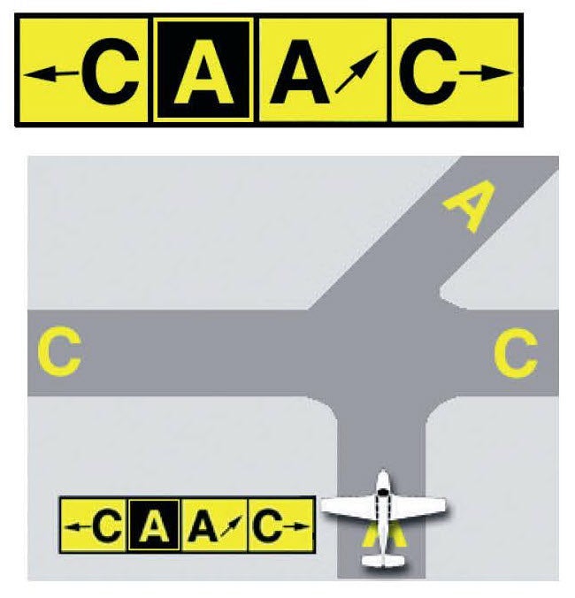 Here, the sign indicates to pilots they are on taxiway A, which continues to the right and taxiway C is perpendicular in both directions. (Note that the taxiways are referred to using the NATO phonetic alphabet. This plane is on "Taxiway Alpha".)