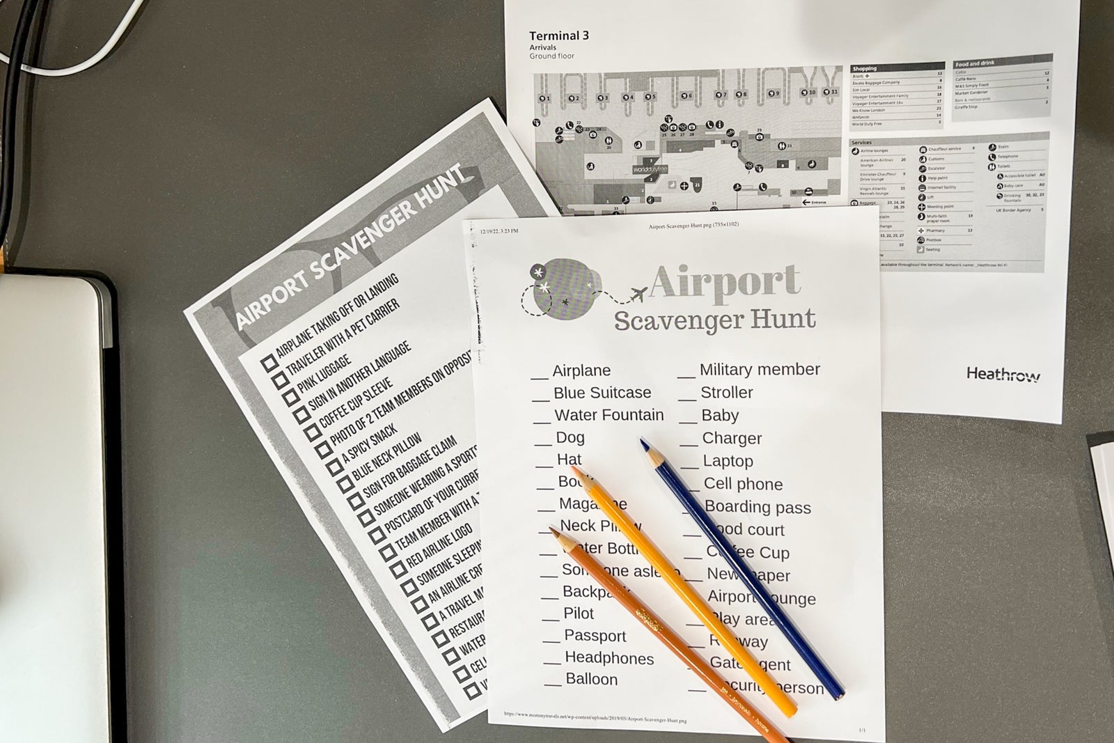 Scavenger hunts are a great way to make airport layovers entertaining for kids. As I was traveling with a teenager and an 8-year-old, the same ideas wouldn't work for both kids, so I downloaded different options like a food hunt and an airport hunt for airline companies and aircraft.