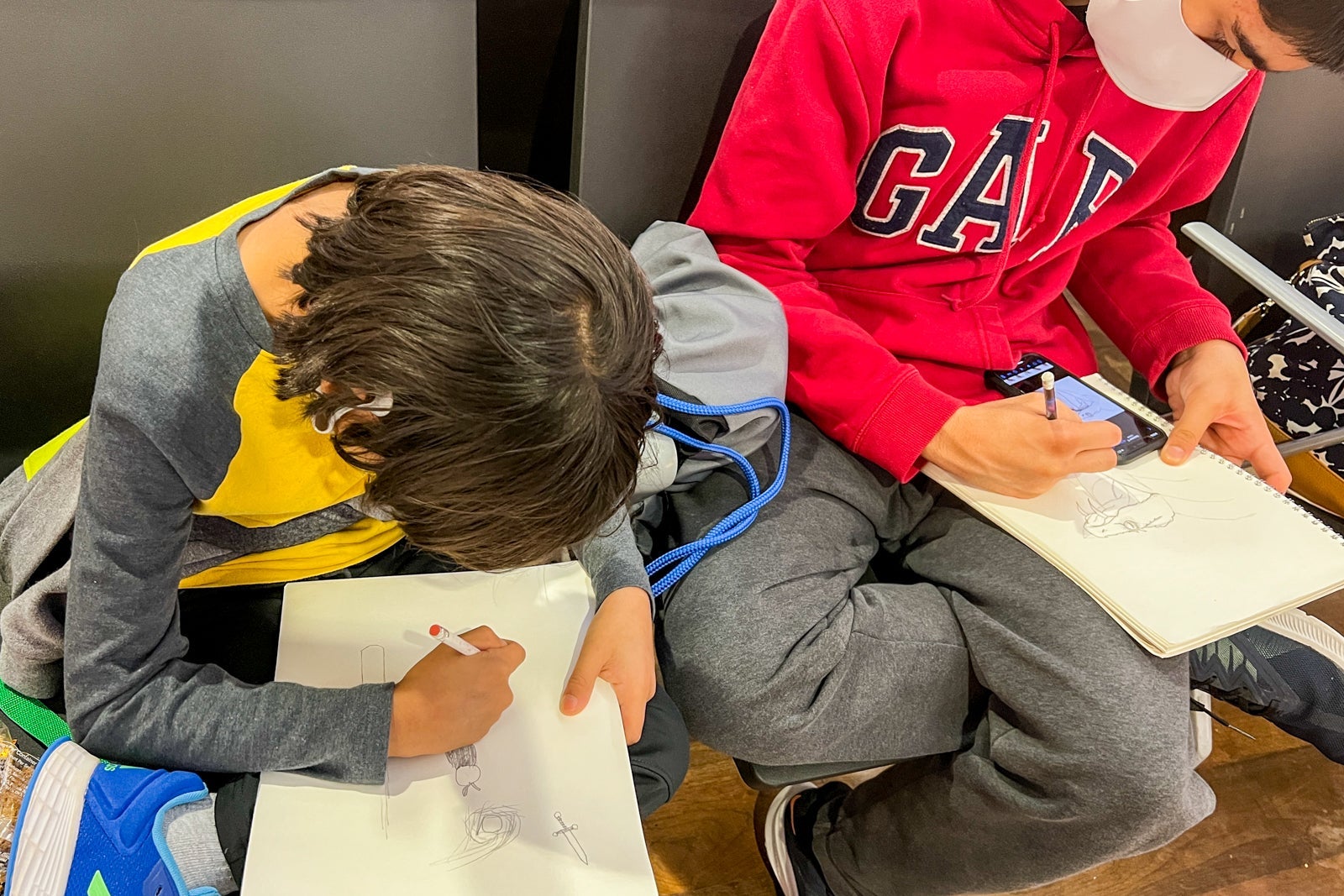 My youngest child has no interest in or patience for drawing, but his elder brother sometimes manages to motivate him. At this particular moment, that skill was key.
