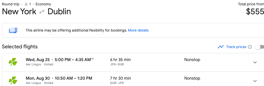 Flying from New York City to Dublin was the most expensive of the three cities but still a good deal around $550.