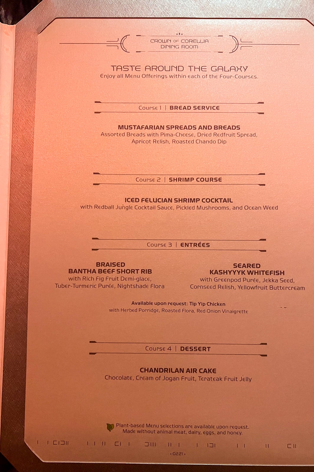 The food on the ship isn't bad, and at times it's quite inventive. From a flavor perspective, however, I generally prefer the included food on Batuu at Hollywood Studios. In other words: Don't be afraid to use your credits on lunch in Hollywood Studios.