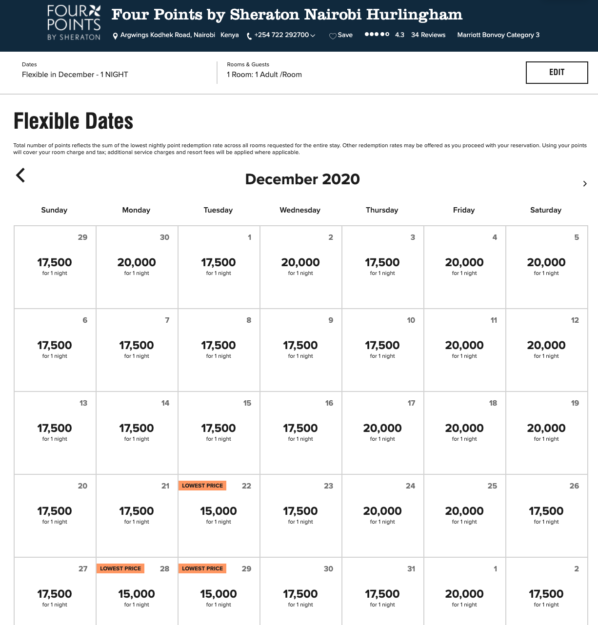 Hotel options are plentiful for October dates and later, with more than 1,000 hotels bookable on Hotels.com in Nairobi alone. The aforementioned Giraffe Manor is open for visitors, at an all-inclusive rate of $1,375 per night for a single room. On the more affordable end of the spectrum, Marriott's Autograph Collection Sankara Nairobi begins at $150 or 30,000 Bonvoy points per night, while the Four Points Sheraton Nairobi Hurlingham begins at $86 or 15,000 points per night in December 2020.