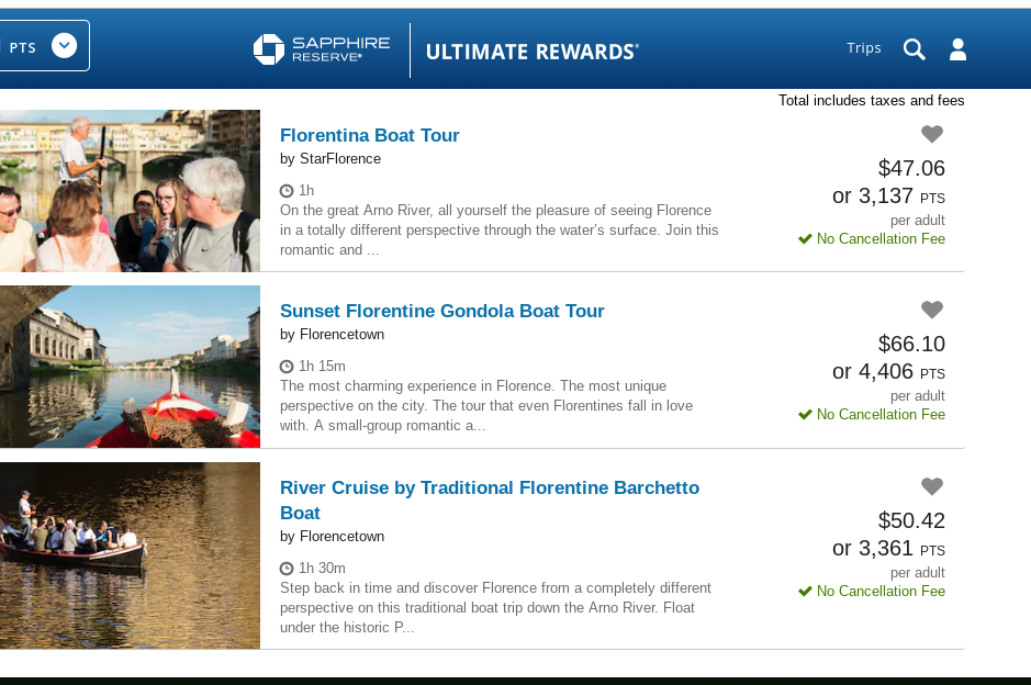 A variety of outfits offer the opportunity to float down the Arno River, a unique vantage point from which to see the city and glide under the Ponte Vecchio. T-Rafting offers 1.5-mile guided trips on inflatable rafts that are suitable for families (€25 adults, €20 children), while Star Florence provides a more sedate guided experience in a historic barchetto (€42 per person). Availability varies with demand and the season. You could book Arno River cruises through the Chase Ultimate Rewards travel portal to keep cash in your wallet. Prices start at 3,137 Ultimate Rewards points if you have the Chase Sapphire Reserve.