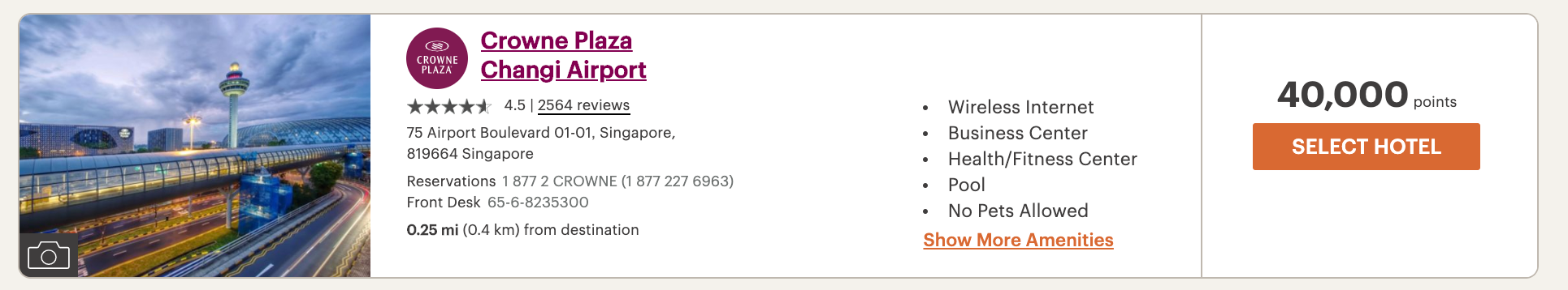 Changi is also home to a Crowne Plaza for those looking for a full-service hotel experience, with rooms starting at about ~$200 or 40,000 IHG points per night. The Crowne Plaza sells day room passes for those simply looking for a quiet place to shower and recollect before their next flight, while the YotelAir sells rooms by the hour for the same purpose. Terminals 2 and 3 also feature an Ambassador Transit Hotel.