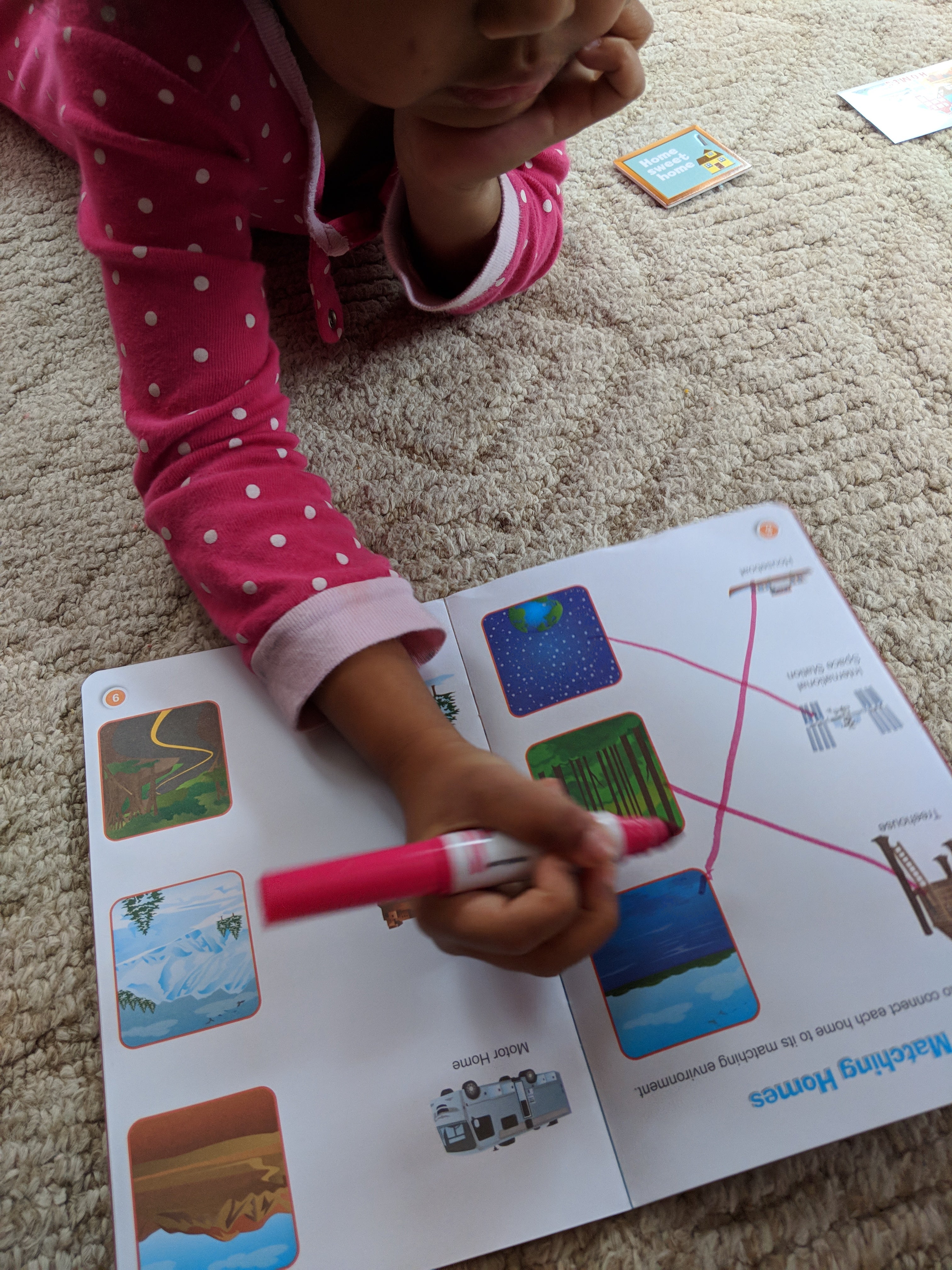 Some of the activities in the books were not challenging and were color-coded. By this, I mean that the house with the orange outline in column one matched with the orange continent in column two. So, while my 4-year-old completed the activity books mostly independently, was she actually thinking about what kind of house would be in Europe versus Africa? I don't think so.