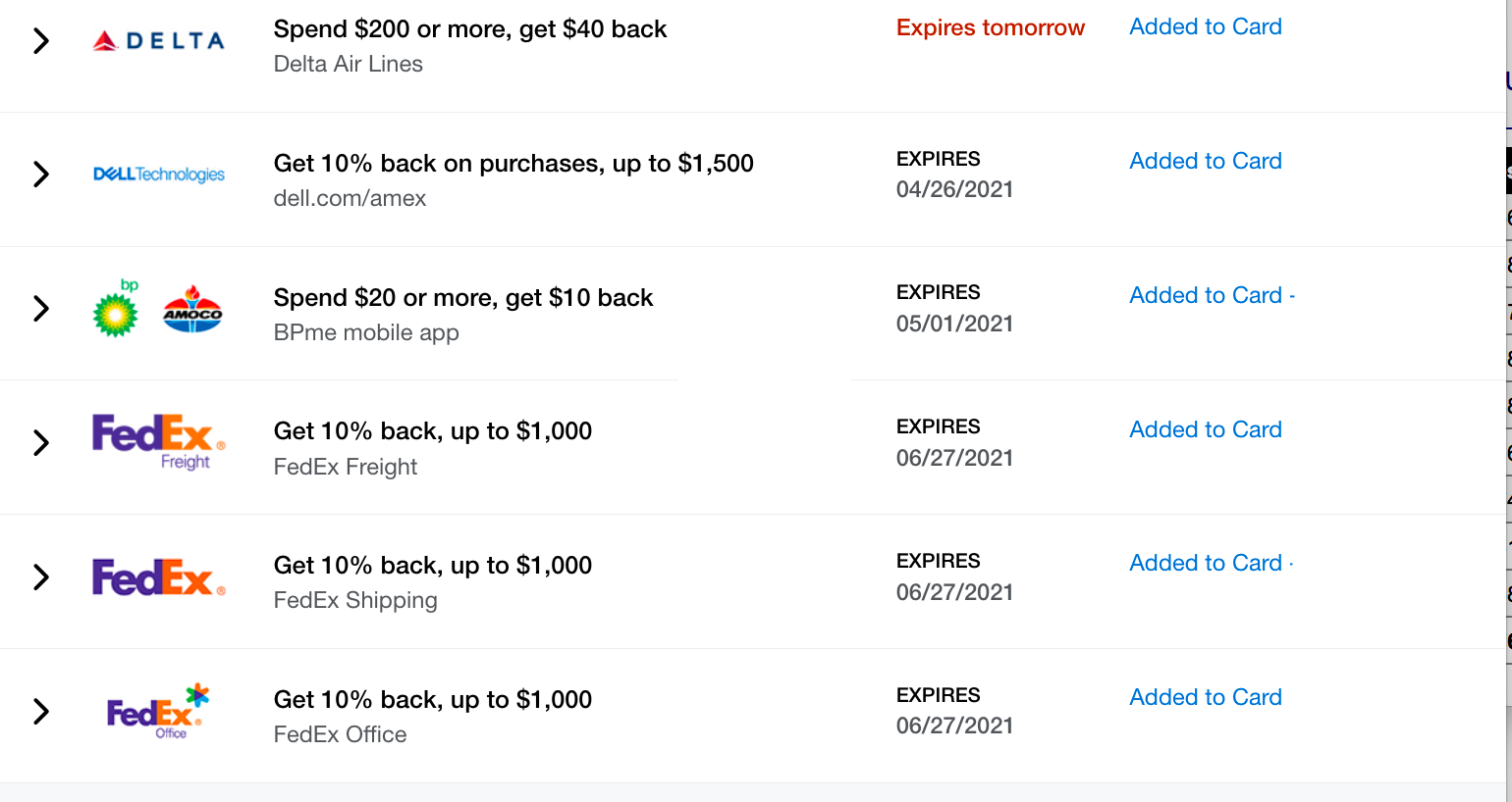 The FedEx offers have been rolling six-month offers since we signed up for the card. I added all of these offers even though I wasn't 100% sure I would use all of them. That's my general rule of thumb — I don't want to miss out on any potential offer that might be valuable in the future.