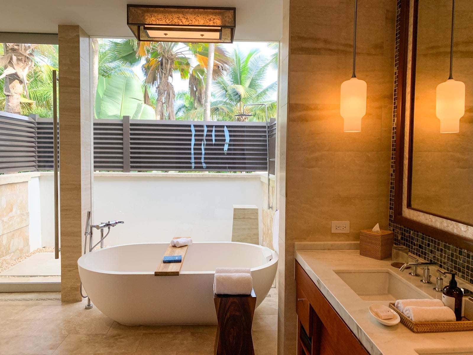The Conrad Koh Samui has long been a favorite Thai resort amongst points collectors thanks to its magnificent setting in a rainforest along the Gulf of Thailand and plentiful award availability. The main selling point in terms of bathrooms here is that most rooms have at least some view from the tub, even in starter categories like one-bedroom pool villas. The views get better the nicer the room or suite, though.
