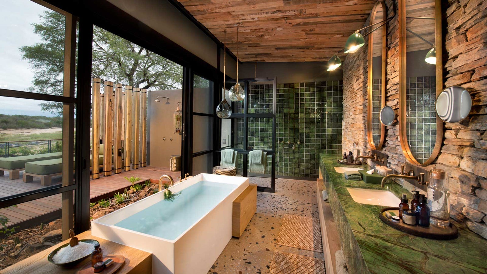 Stepping away from traditional tented camps, this lodge in South Africa's Sabi Sands Game Reserve, near Kruger National Park, is modern and sleek, with sustainable elements like salvaged railway stones incorporated into the flooring and sand from the site itself used to insulate the roofs. The nine rooms are among the largest in the region thanks to expansive open-air decks complete with private plunge pools. The rooms "float" on stilts set just back from the Sand River banks, so guests can have a bath with a view of elephants and buffalo doing the same in the waters below.