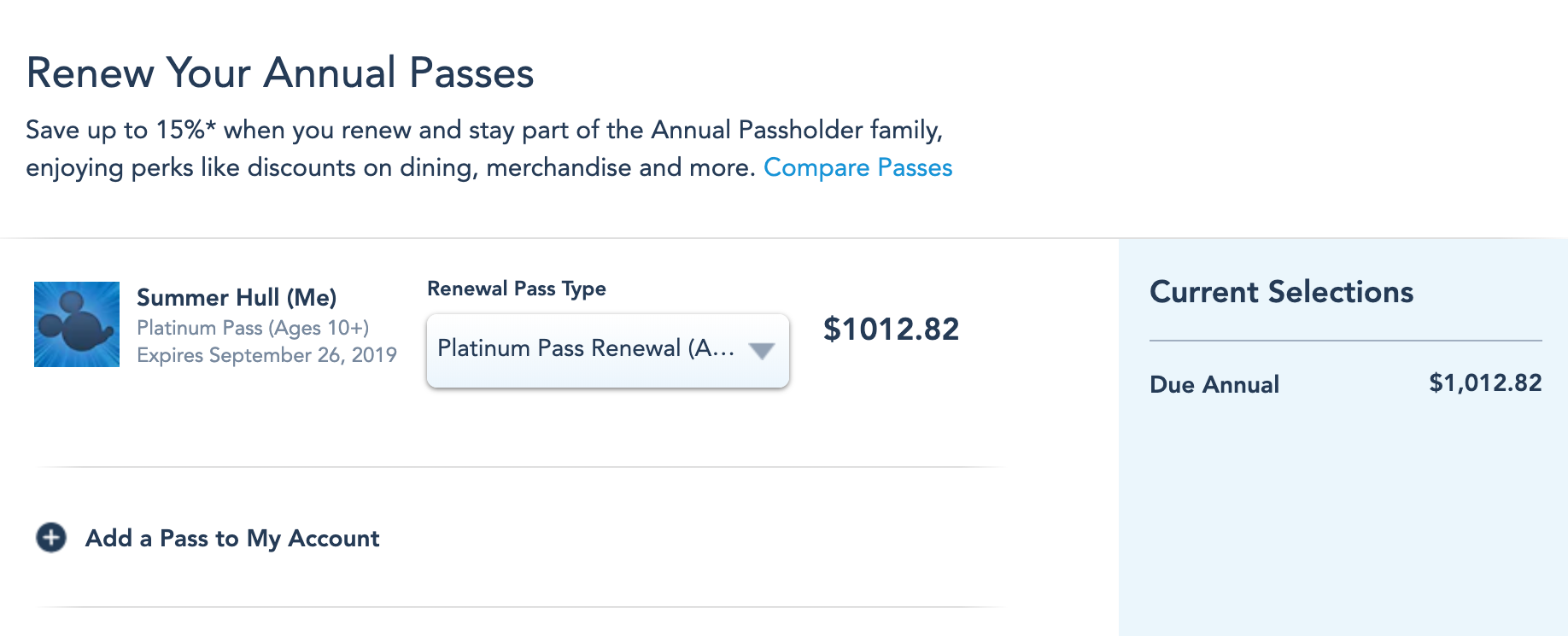 Disney makes it tempting to renew an expiring annual pass because they give you a 15% discount, which is a real amount of savings on something that expensive. If I renewed now, I'd owe $1,012.82 instead of $1,191.74 for a brand-new pass. We do have another short Disney trip planned about three months from now where we will meet up with some friends. That makes it tempting to keep the pass going, but the odds of me going to Disney before that next planned trip are low. If I saved 15% on the price to renew now, I'd still come out behind because the renewed pass would be almost three months (aka 25%) used up before I ever swiped it to enter the park.