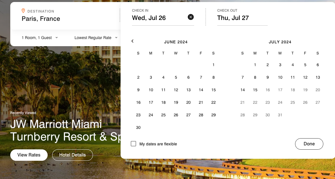 The IHG booking window for Paris during the 2024 Olympics. IHG ONE REWARDS