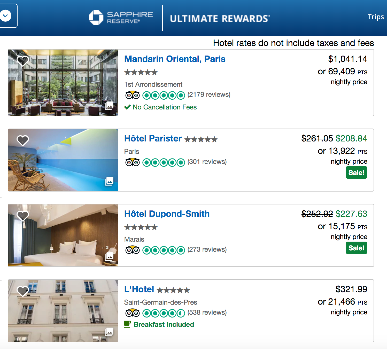 You can book hotels directly through Chase's travel portal and pay cash or redeem Ultimate Rewards points. The portal offers more than 90 five-star hotels in Paris. I'm sure a stay at the Mandarin Oriental, Paris would be lovely and it's going for 69,409 Ultimate Rewards points per night for a date in December.