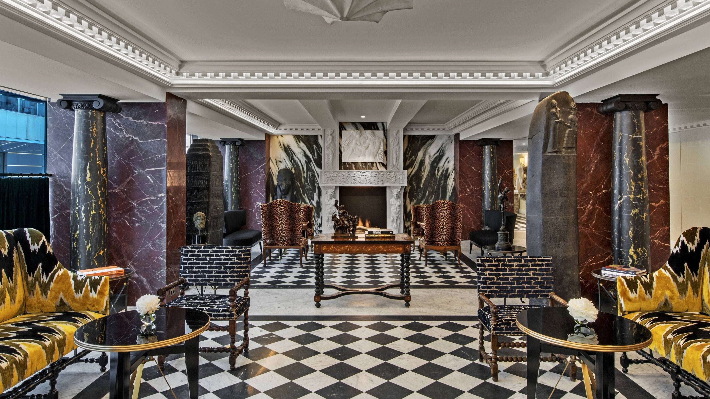 Bold is the word I use to describe Hotel de Berri. The lobby is a study in marble, with black columns and crimson pillars along with animal print furniture. There are several striking fireplaces and sculptures throughout the lobby. Guest rooms are more understated, with yellow, cream or green walls and large beds dressed in crisp white linens.
