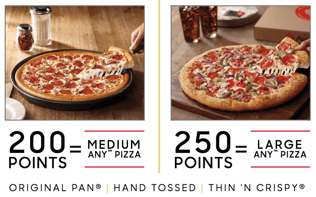As for rewards, there are two options: a medium pizza (200 points) or a large pie (250 points). Or multiple pizzas if you've racked up tons of points that you'd like to redeem all at once. You can select any pizza with unlimited toppings, but stuffed crust, extra cheese, delivery fees and tips cost extra. Depending on the store, you may need to add paid items to your order to meet a delivery minimum.