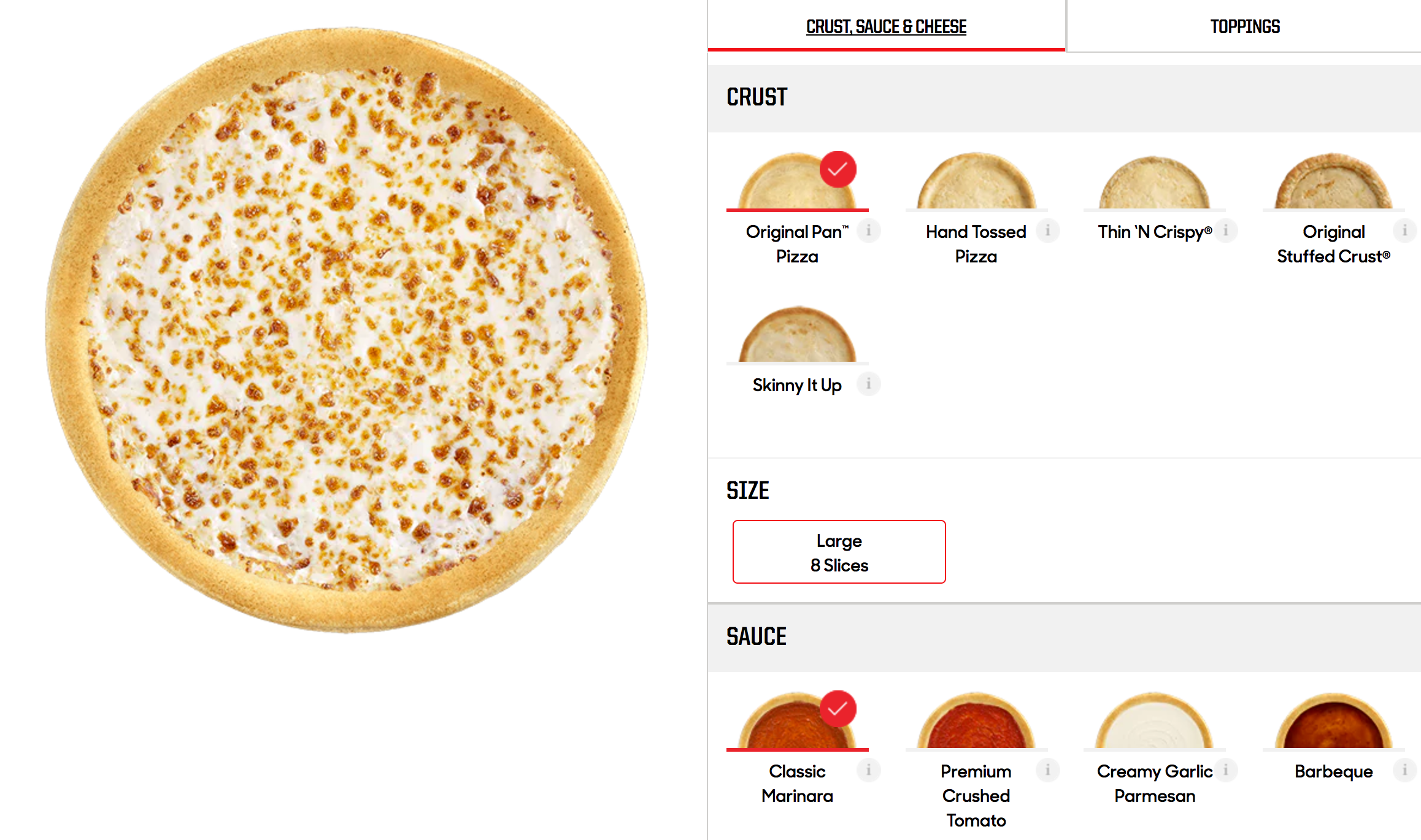 To that end, I put together a table to give you an idea of how many calories you'll need to "spend" to earn a free pie. I included a few of the countless combinations available through Pizza Hut's website and app, starting with a basic Large Original Pan Pizza, with nothing but sauce and cheese.