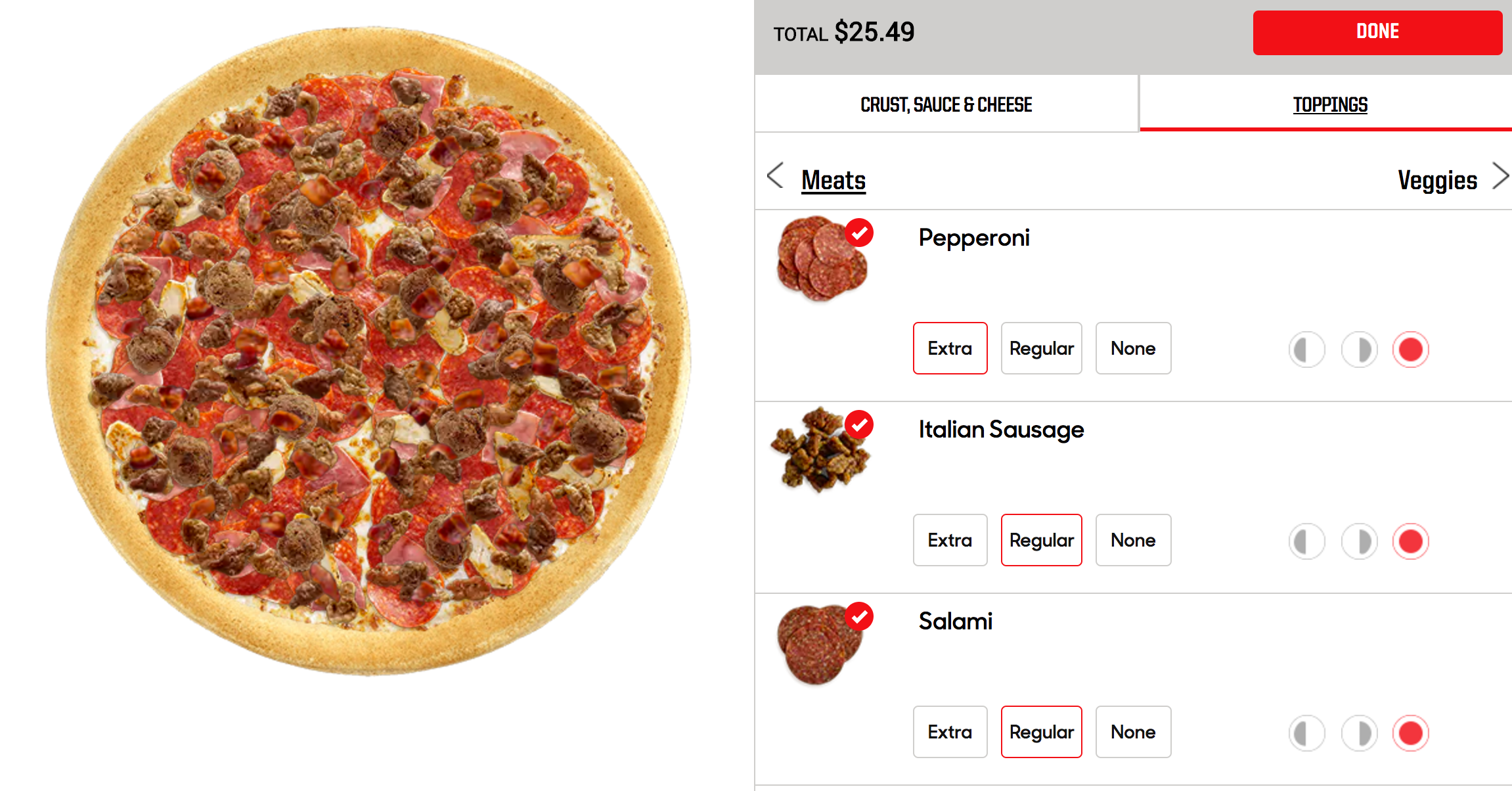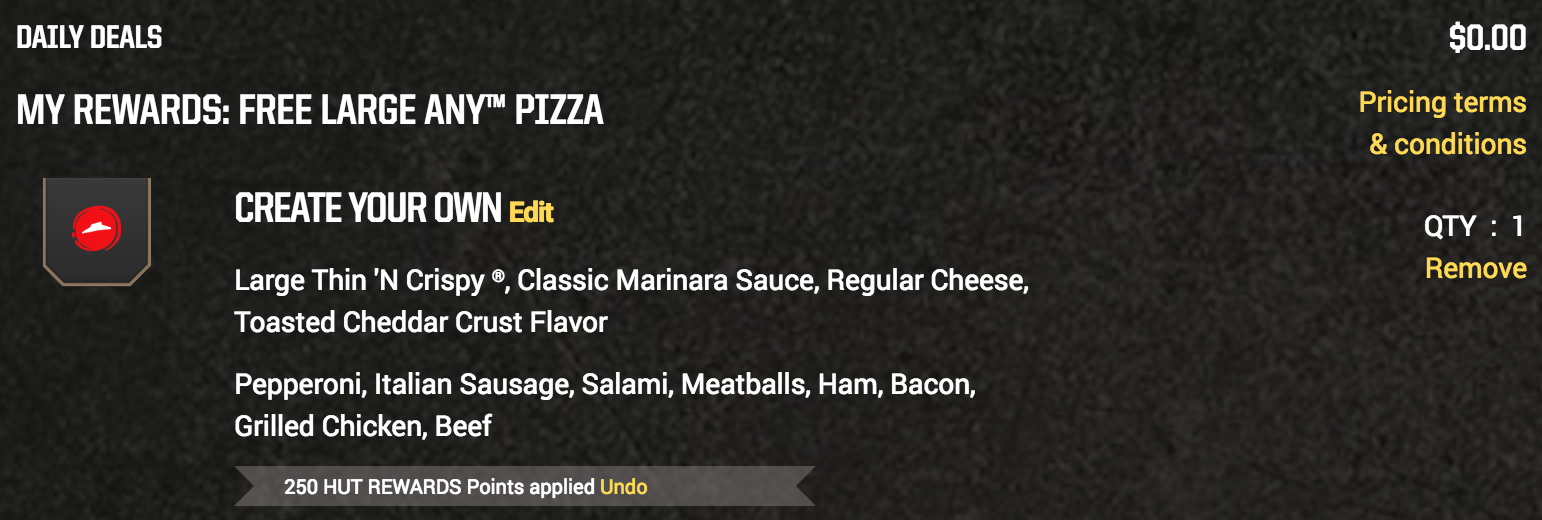 Update: I requested 250 points (for research/fact-checking purposes). During checkout, it became clear that free pizzas max out at eight toppings — you can add a total of 10, if you'd like, but toppings #9 and 10 will require a co-payment of $1.25 (plus tax) each for a medium pizza or $1.50 each for a large: