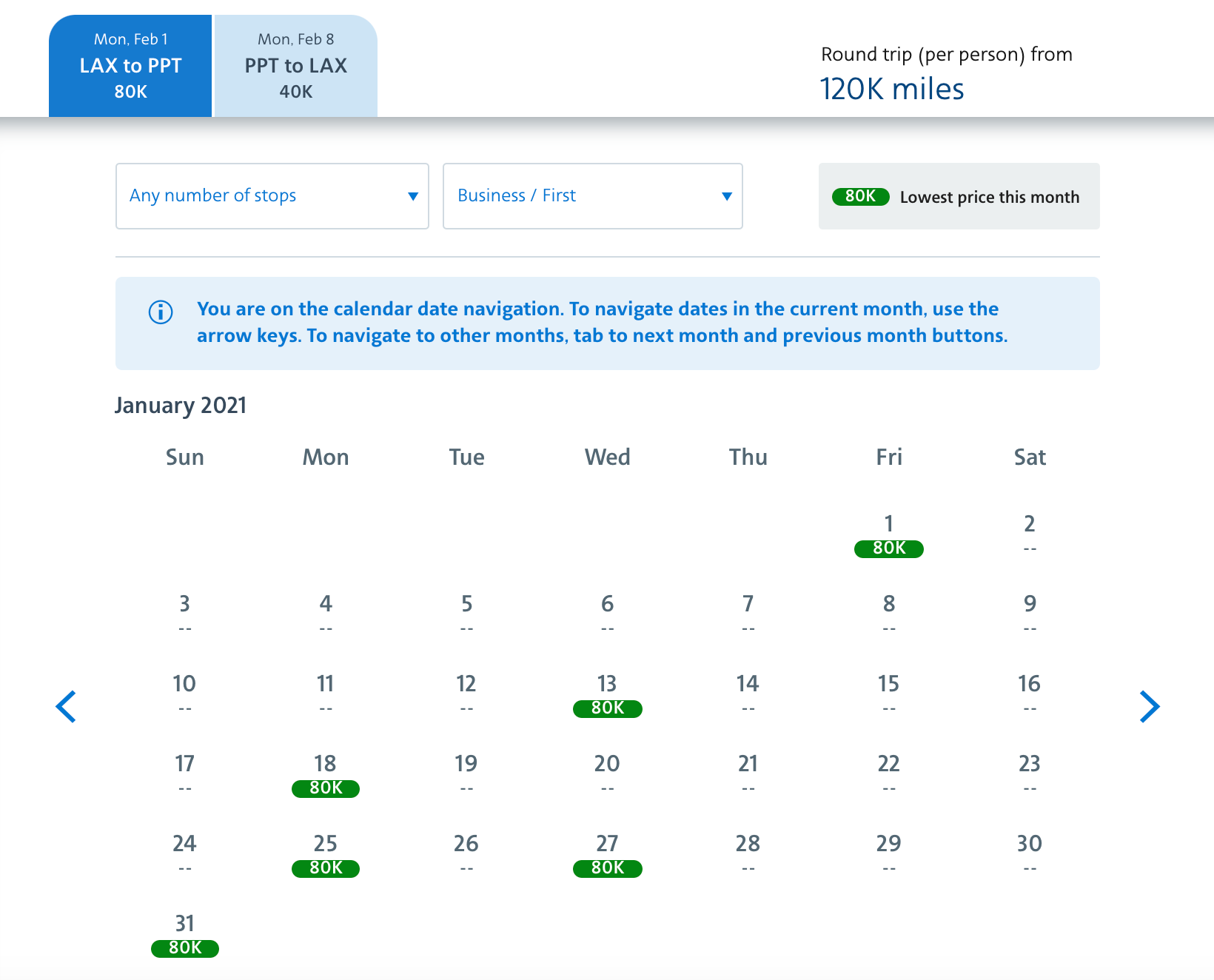 Checking Air Tahiti Nui award availability via American Airlines' search engine, we found plenty of economy class awards available in January 2021 (from 80,000 miles round-trip plus $55.05). Business-class availability is more scattered, but it's possible to get seats on a variety of flights (from 160,000 miles round-trip).