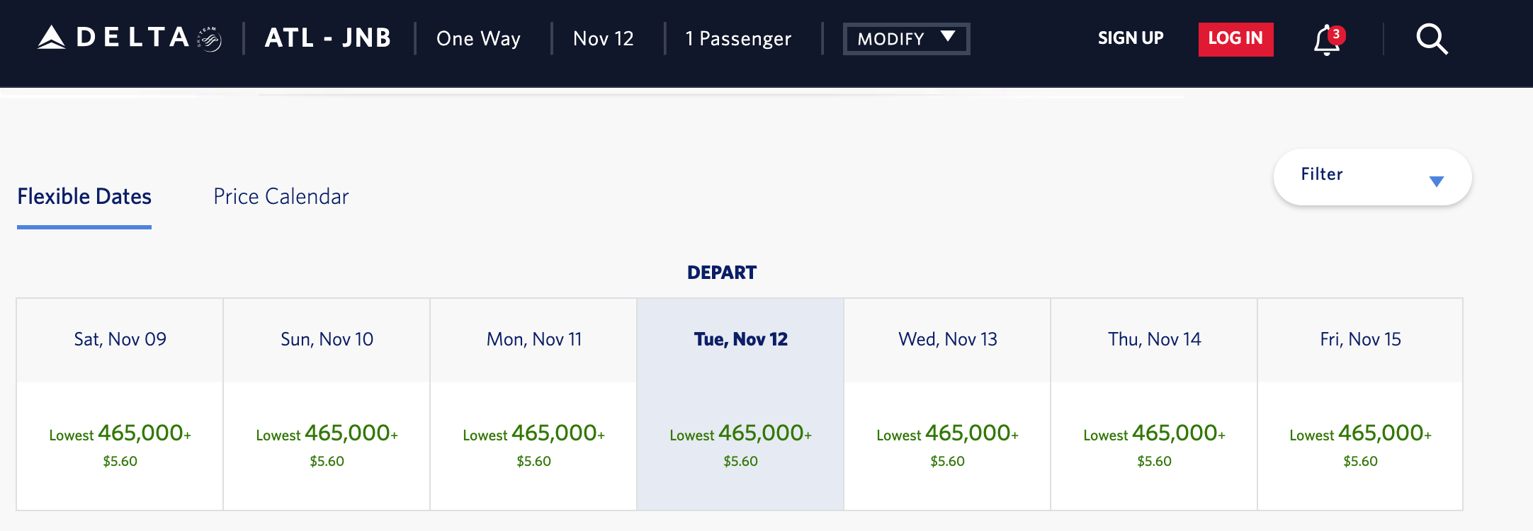 Nowhere is this phenomenon more readily observable than when it comes to long-haul, premium-cabin awards on Delta. The carrier was the first of the major US airlines to introduce dynamic award pricing, meaning that Delta's SkyMiles program will charge some truly exorbitant rates on certain routes, such as these one-way, business-class awards from Atlanta (ATL) to Johannesburg (JNB) for 465,000 SkyMiles.