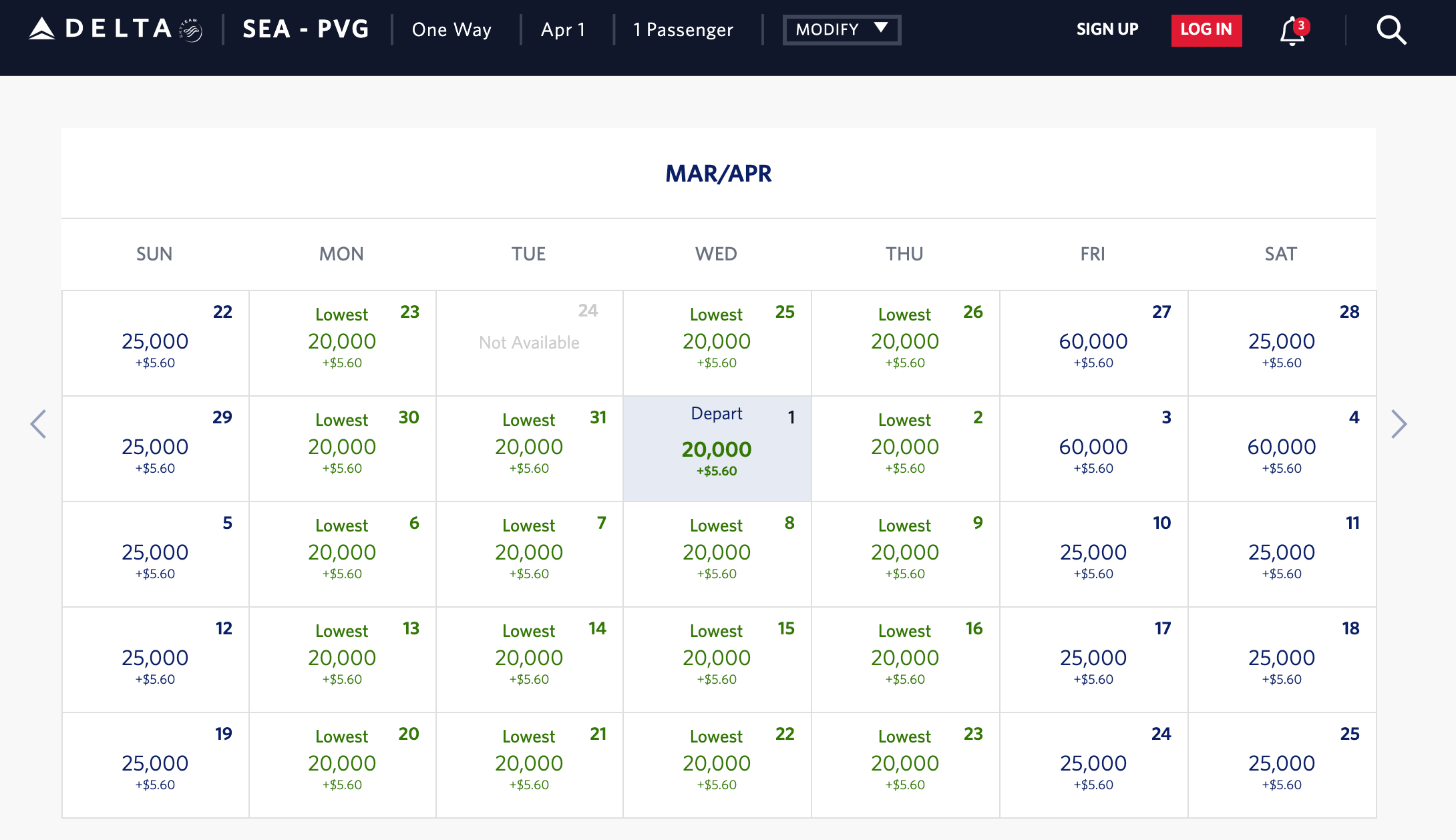 While economy award space is better across the board, the savings are much smaller — and in some cases, it disappears entirely. The three routes with negative savings (DTW-PEK, SEA-PVG and PVG-SEA) actually indicate that on average, it's cheaper to book these awards through Delta instead of Virgin Atlantic. If we zoom in specifically on Seattle to Shanghai, you an see that for the entire month of April 2020, Delta doesn't charge more than 25,000 miles for a one-way, economy award, worth $300 based on TPG's valuations.