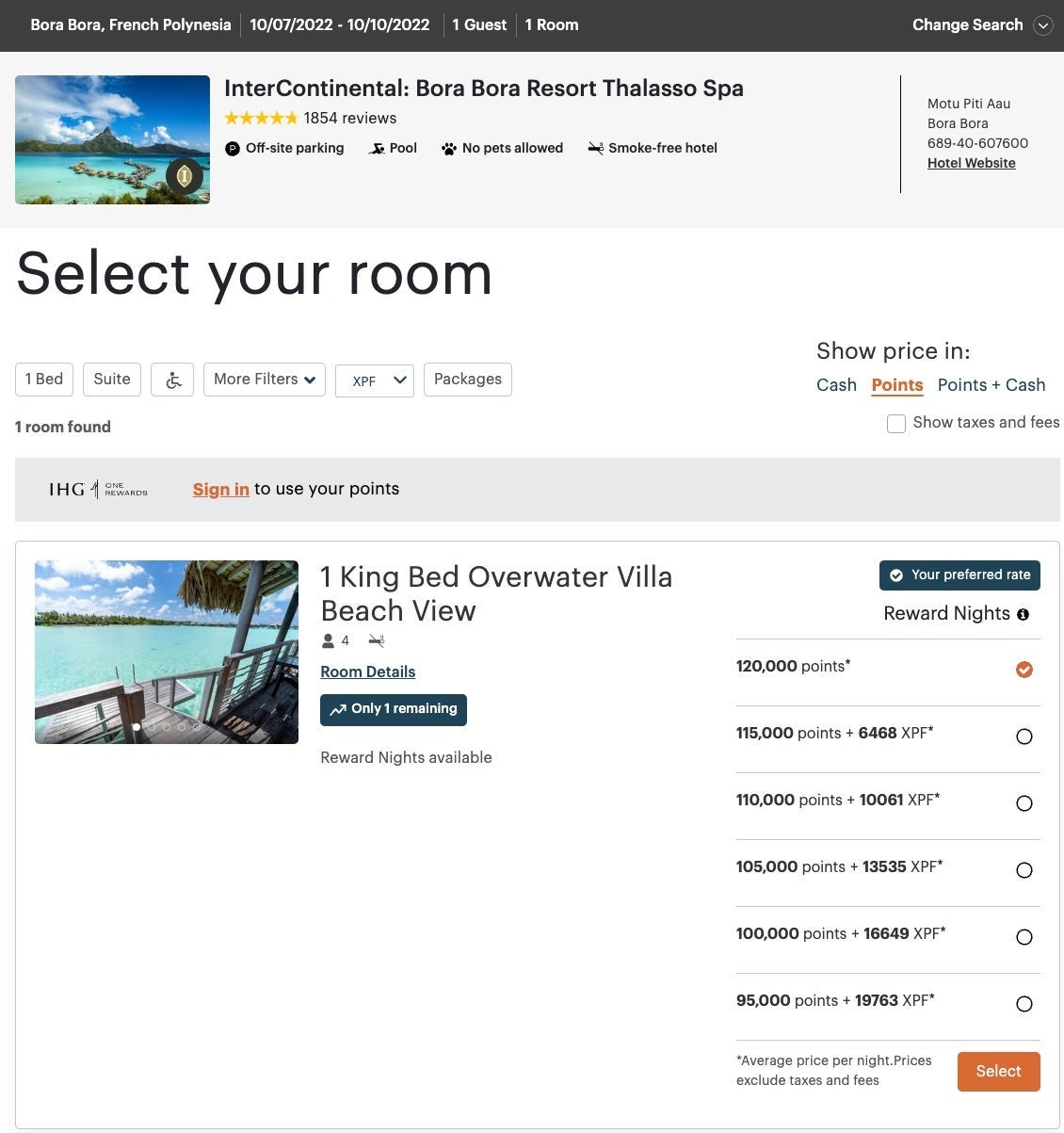 One of the biggest unicorns in the hotel award space is the InterContinental Bora Bora Resort Thalasso Spa. This IHG hotel is almost impossible to book with points.