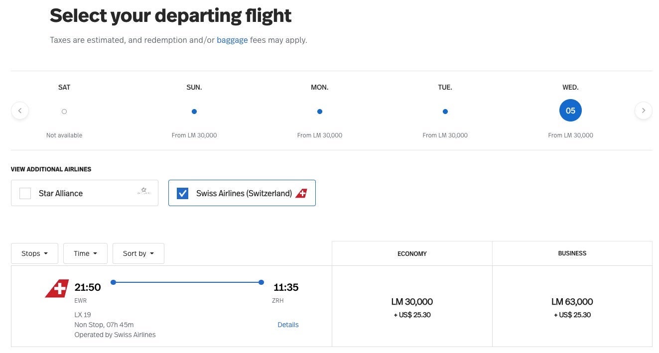 Swiss International Air Lines business class tends to have good availability eight days from the current date — and it often gets scooped up quickly, as you'll likely notice availability isn't nearly as good on days 1-7 from today.