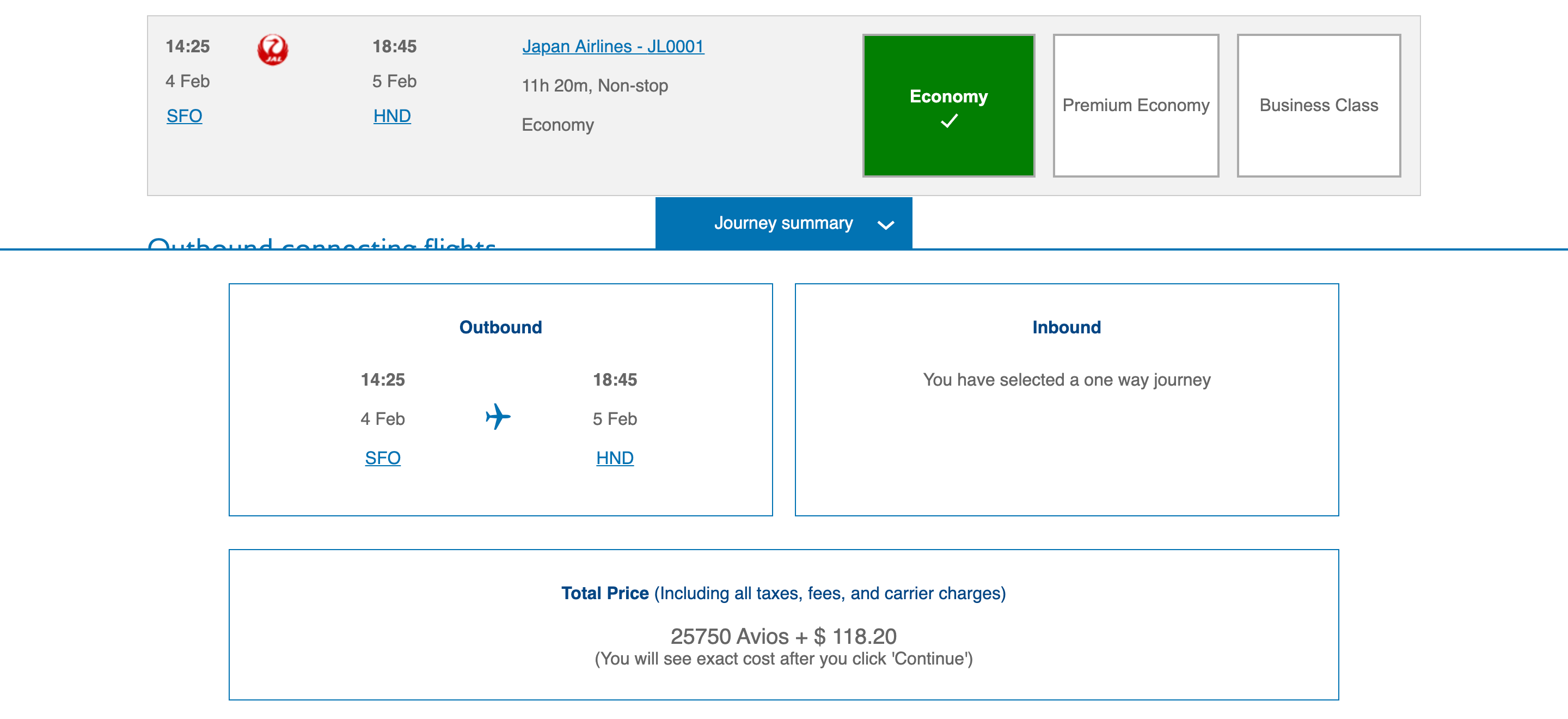 While you'll generally want to avoid long-haul redemptions, flying from the coasts will make it cheaper. For example, you can book a one-way ticket from San Francisco (SFO) to Tokyo-Haneda (HND) on JAL for only 25,750 Avios and $120 in taxes.
