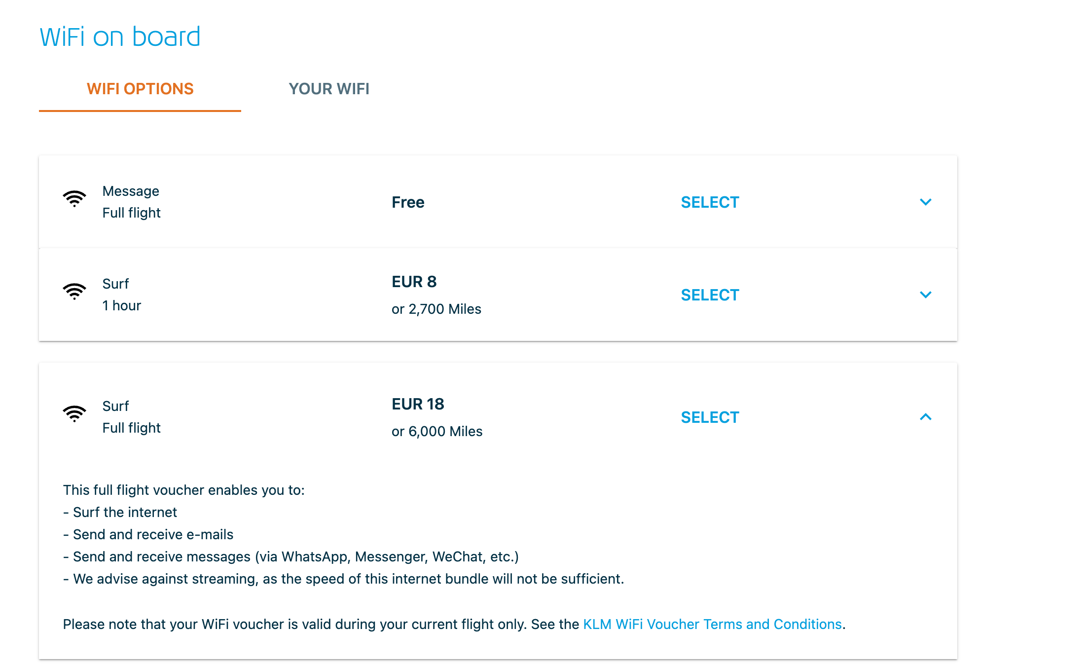 For example, Dutch carrier KLM can sell you Wi-Fi onboard, with prices starting at 8 euros ($8.75) or 2,700 Flying Blue miles for one hour of surfing. Alternatively, you can pay 18 euros ($19.65) or redeem 6,000 Flying Blue miles for a full-flight internet package.