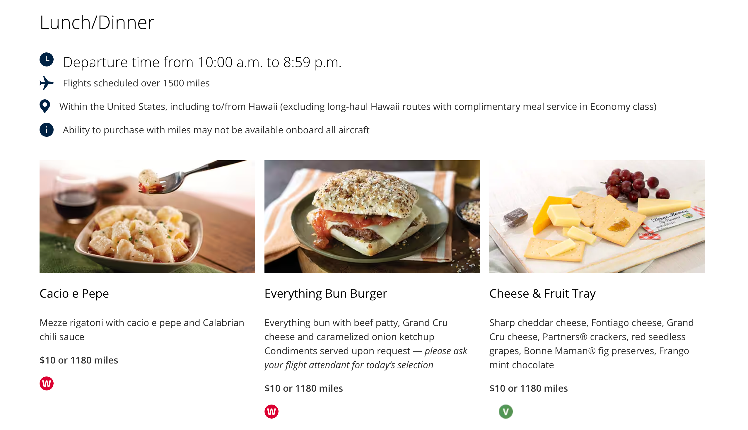 United Airlines offers several lunch and dinner options to purchase on domestic flights more than 1,500 miles in length. Each can be purchased for $10 or 1,180 MileagePlus miles. Divide the cost ($10) by the number of miles (1,180). This gives you a redemption value of 0.84 cents per mile.