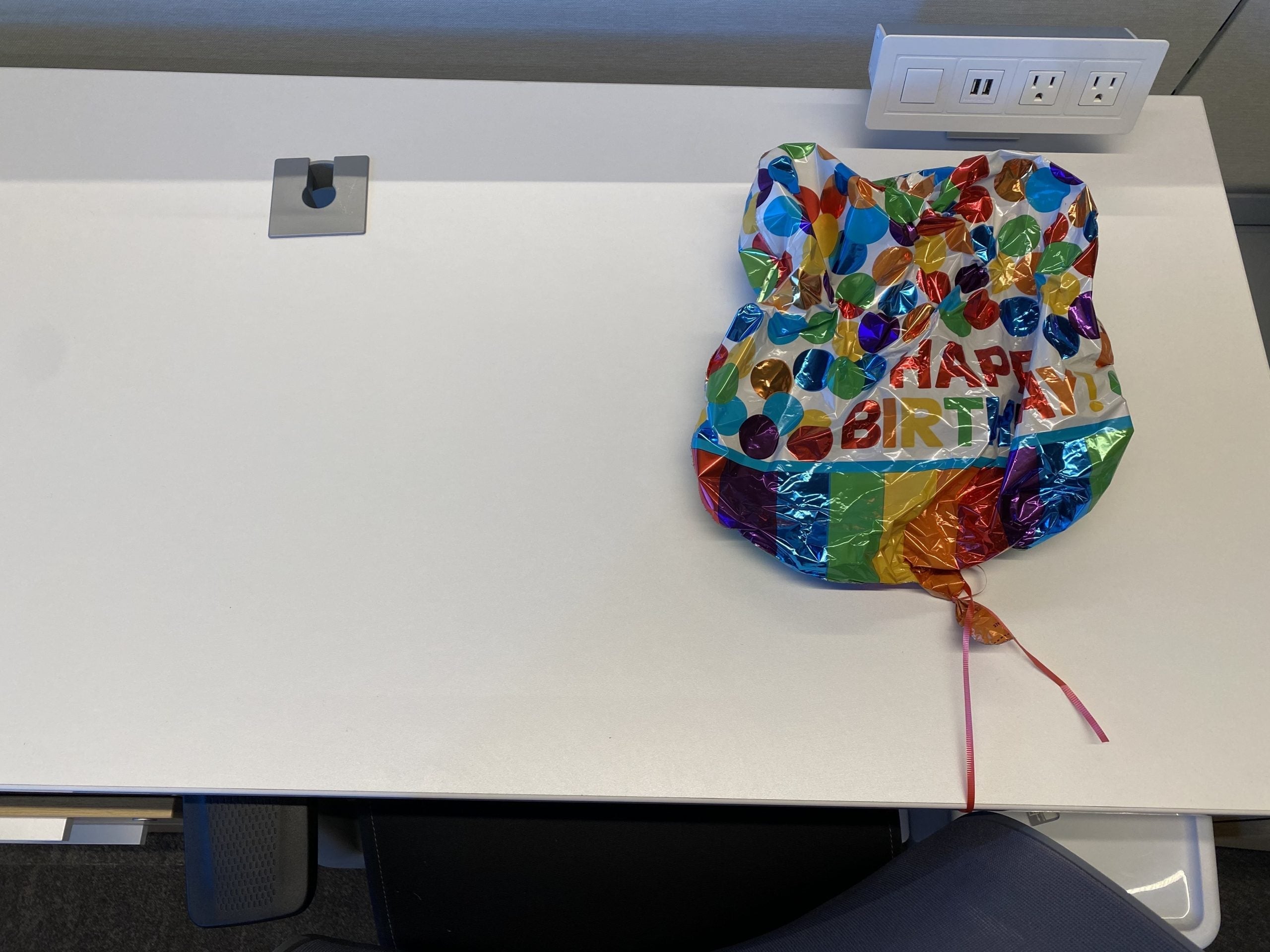 Abandoned birthday balloons remain tied to desks but now lie flat, fully deflated. The recipients of those balloons have all had another birthday since they last saw those gifts that still await their return.