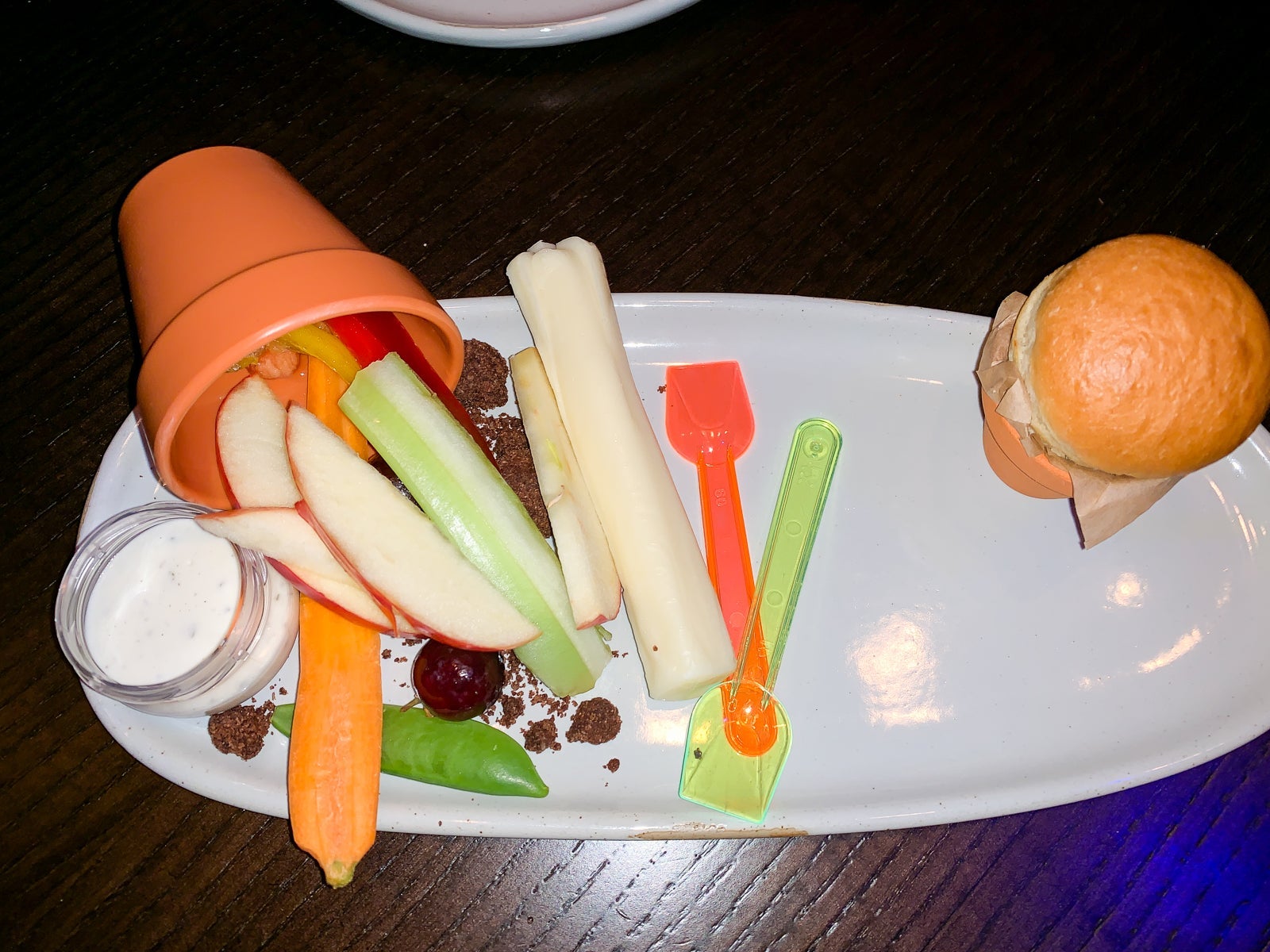 Kids will get fruit, veggies, cheese, and a "create your own butter" as their first round. As with most things Disney, it's the details that make this awesome. The child appetizers are served in what looks like a miner's bucket, which totally fits with the dwarf theme. The "dirt" in the bucket also tastes delicious, but it was the tiny roll served in a small pot that had my kids begging for seconds (which was happily provided).