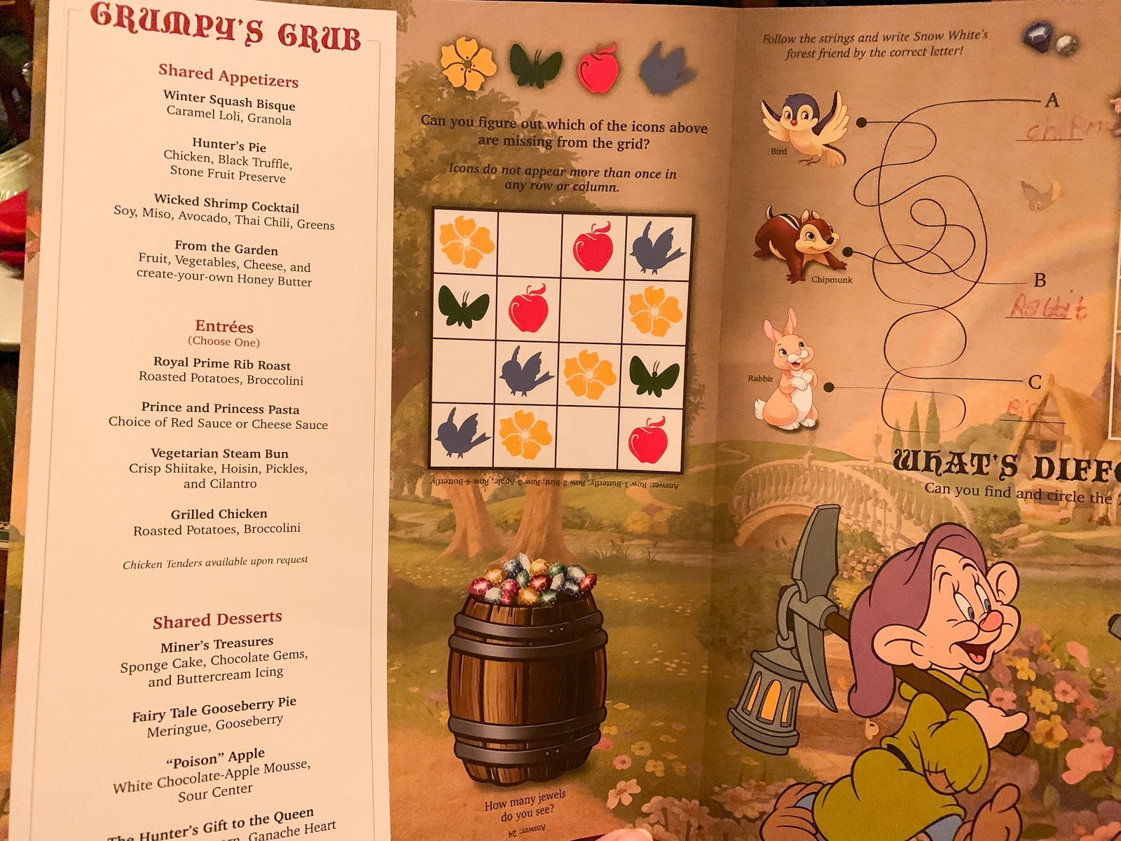 It was hard to decide on a main course as there were multiple tempting choices. You can pick from a Royal Prime Rib Roast, Brothers Grimm Roasted Chicken, Magic Mirror Slow-Braised Veal Shank, a Seafood Stew, Bashful's Butter-Poached Snapper and A Stroll Through Nature that featured butternut squash, arugula and gnocchi.
