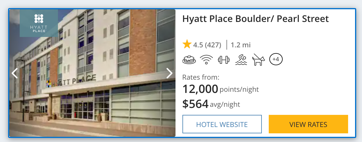 For the first three nights, I booked the Hyatt Place Boulder/Pearl Street. Cash prices are through the roof — $564 per night for her desired travel dates. Meanwhile, I transferred 36,000 Chase points to her World of Hyatt loyalty account to get a terrific 4.7 cents of value. That's almost triple TPG's current valuation of Hyatt points at 1.7 cents each.