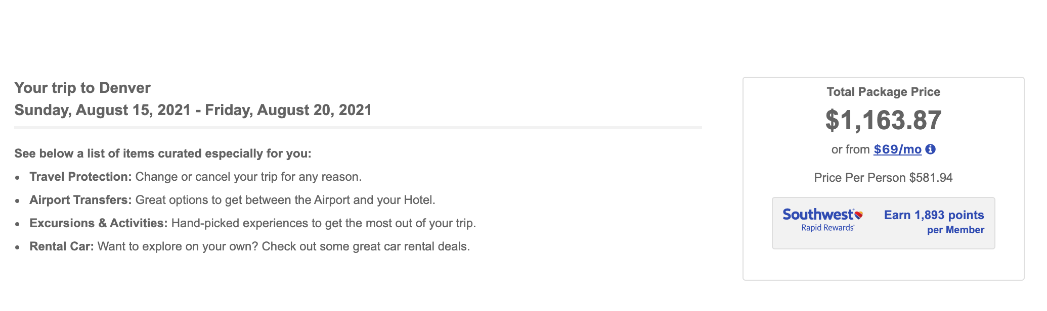 Flights for two people | $475.92 | Southwest Vacations package: Flights for two people and rental car (intermediate SUV) | $1,163.87 |