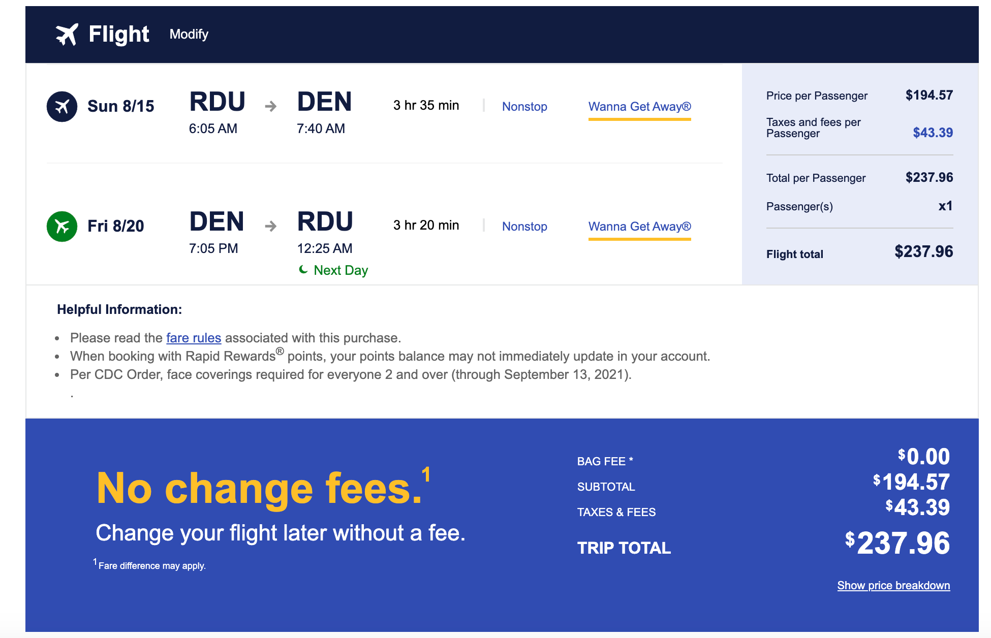 My mom and brother live near Raleigh, North Carolina, so they currently have three options for flying nonstop to Denver from Raleigh-Durham International Airport (RDU): Frontier, Southwest and United. Ultimately, I decided that Southwest was the best option, since they'll each get two free checked bags — perfect for bringing their hiking gear — and the flight times were favorable.