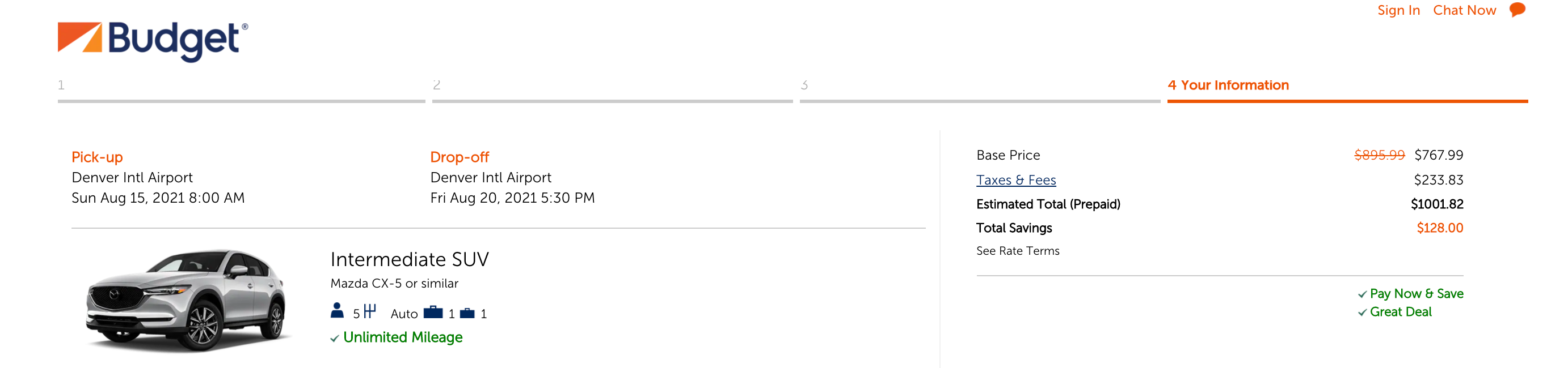On the rental car side, I conducted a quick search on Budget's website, inputting the exact date and the desired car — an intermediate SUV. It cost about $1,000 with taxes and fees.