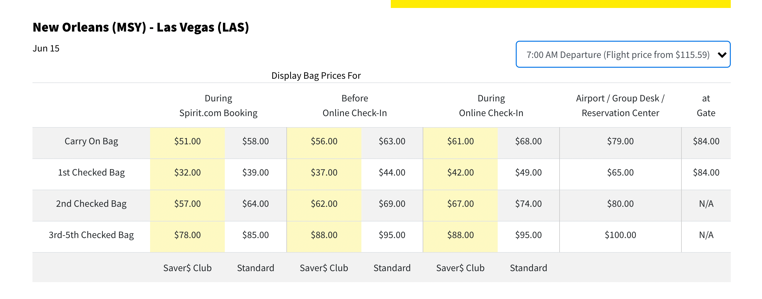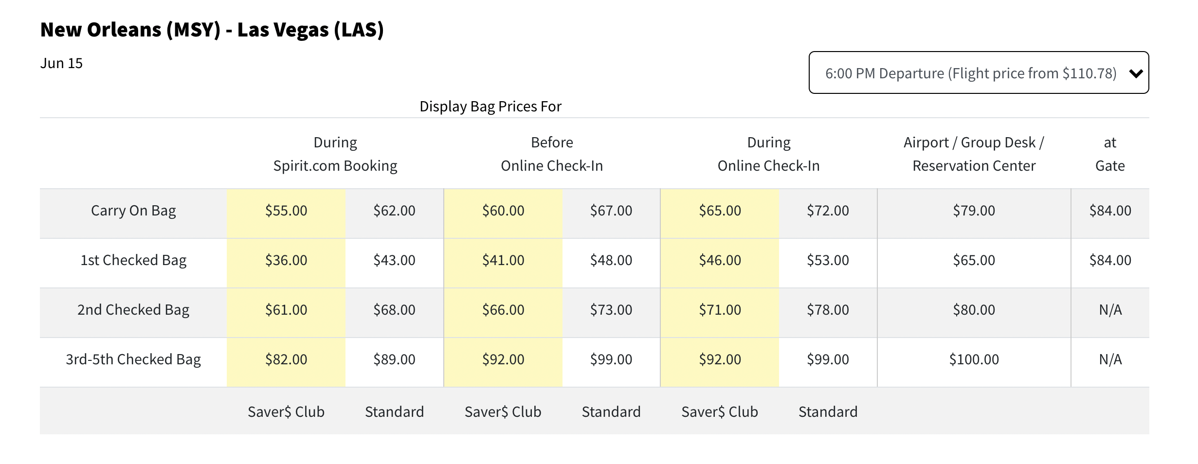 Specifically, the airline uses a dynamic pricing model for carry-on and checked bags. So, flights at different times on the same day between the same city pairs will sometimes have different bag pricing. Here's an example showing two flights on the same day traveling from New Orleans to Las Vegas: