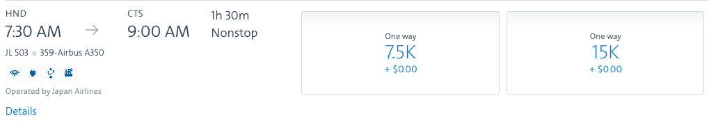 This price is the same for close-in bookings and longer routes such as HND to Okinawa's Naha Airport (OKA), which is nearly three hours and 1,000 miles away. That makes using 7,500 miles (with no fees tacked on) a solid redemption option.