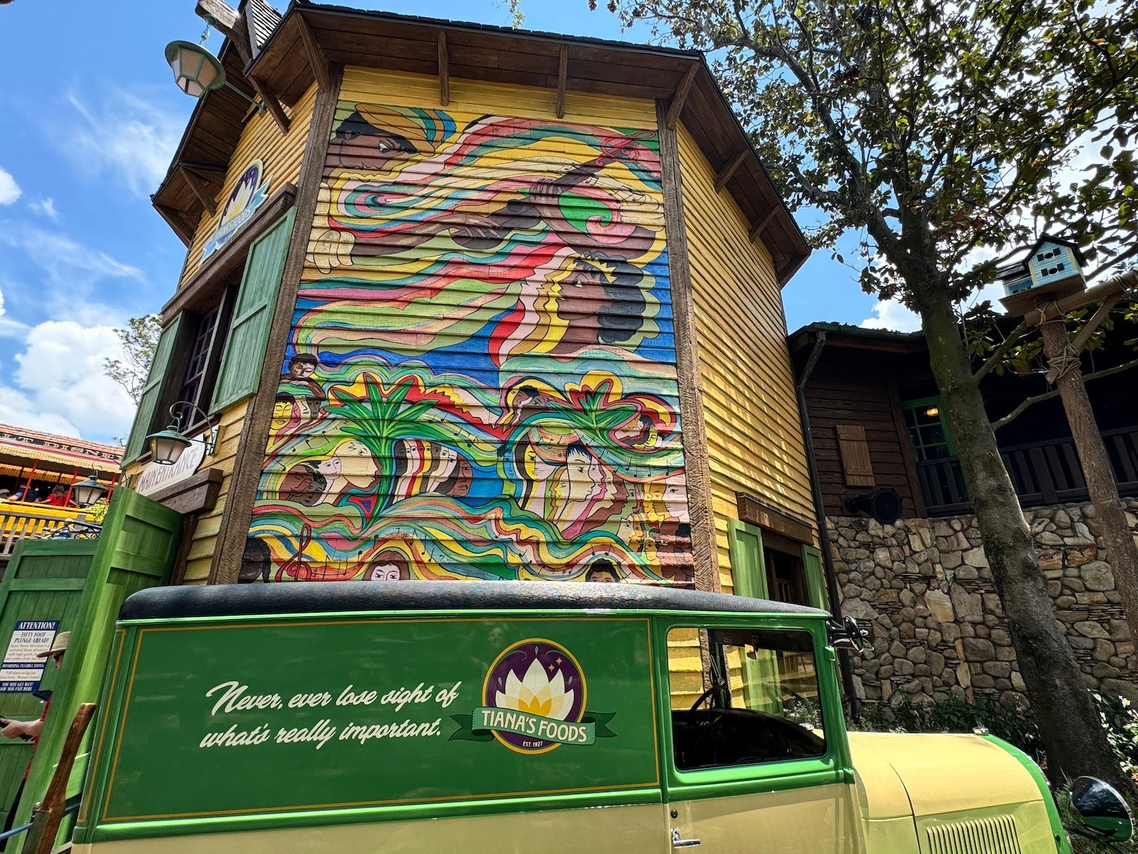 A colorful mural in the queue depicting Tiana's journey as a business owner was created by Malaika Favorite, an acclaimed artist whose work can also be seen in Louisiana's Baton Rouge Gallery, and the weather vane atop the ride's mill house was handcrafted by third-generation master blacksmith Darryl Reeves.