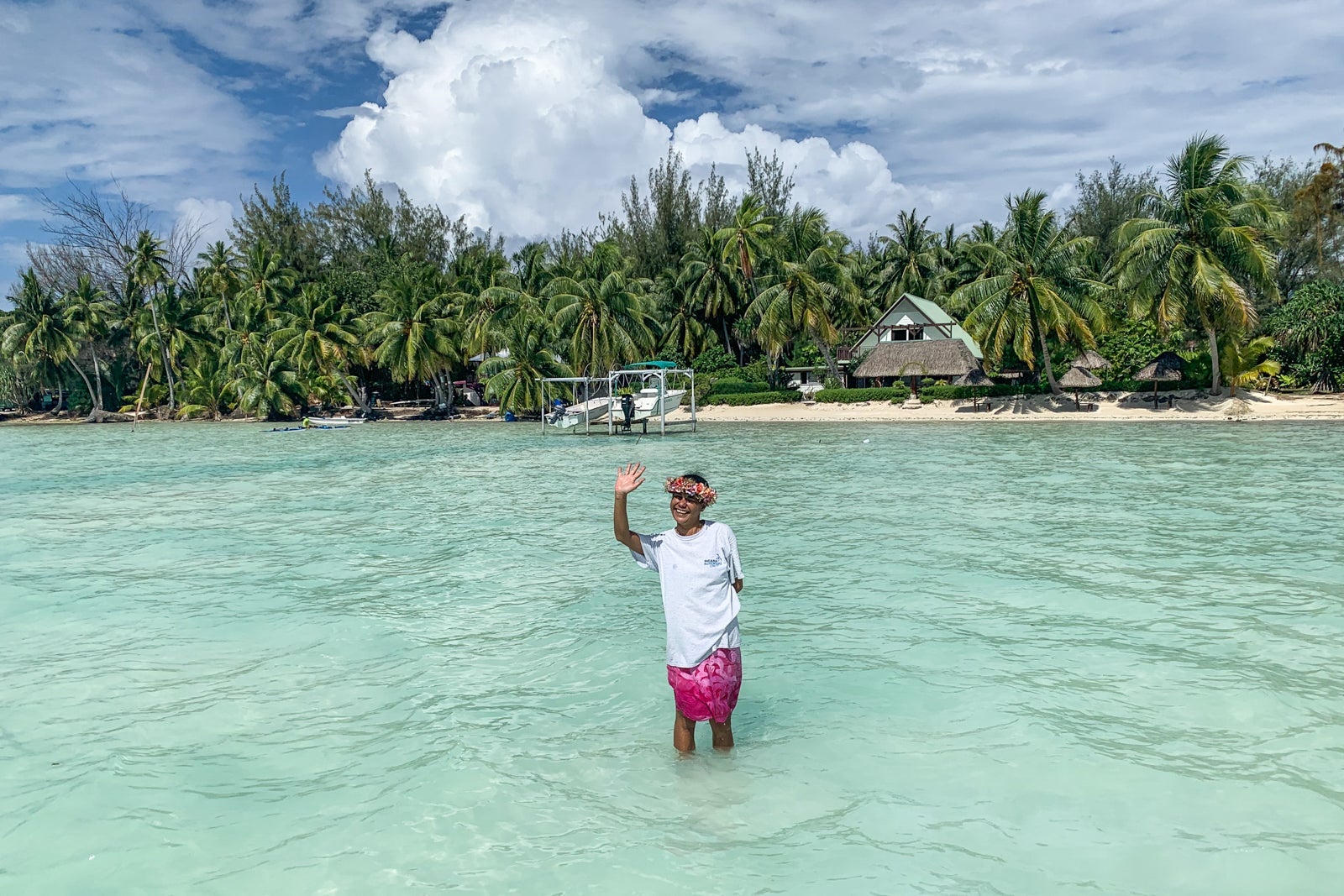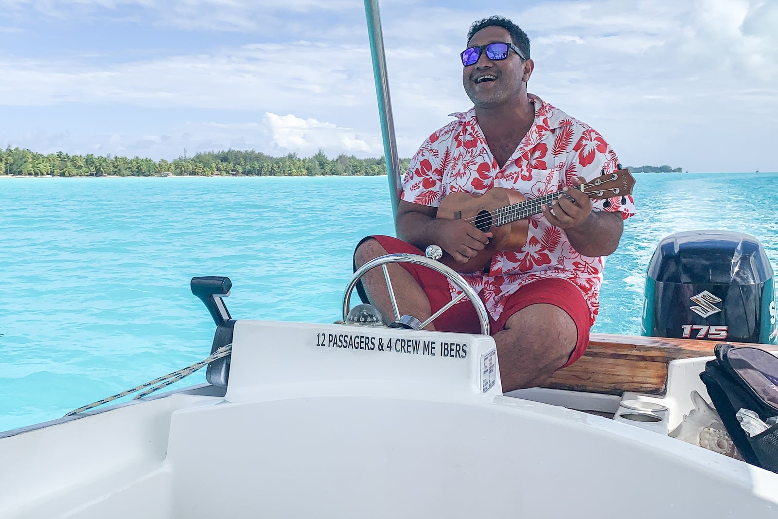 Several couples and I were picked up in a boat driven by a guide who doubled as the tour's entertainment. We started our adventure cruising around the lagoon, listening to soothing tunes coming from the guide's Tahitian version of a ukelele as we went. The music he played throughout the tour really helped set the tone for the day.