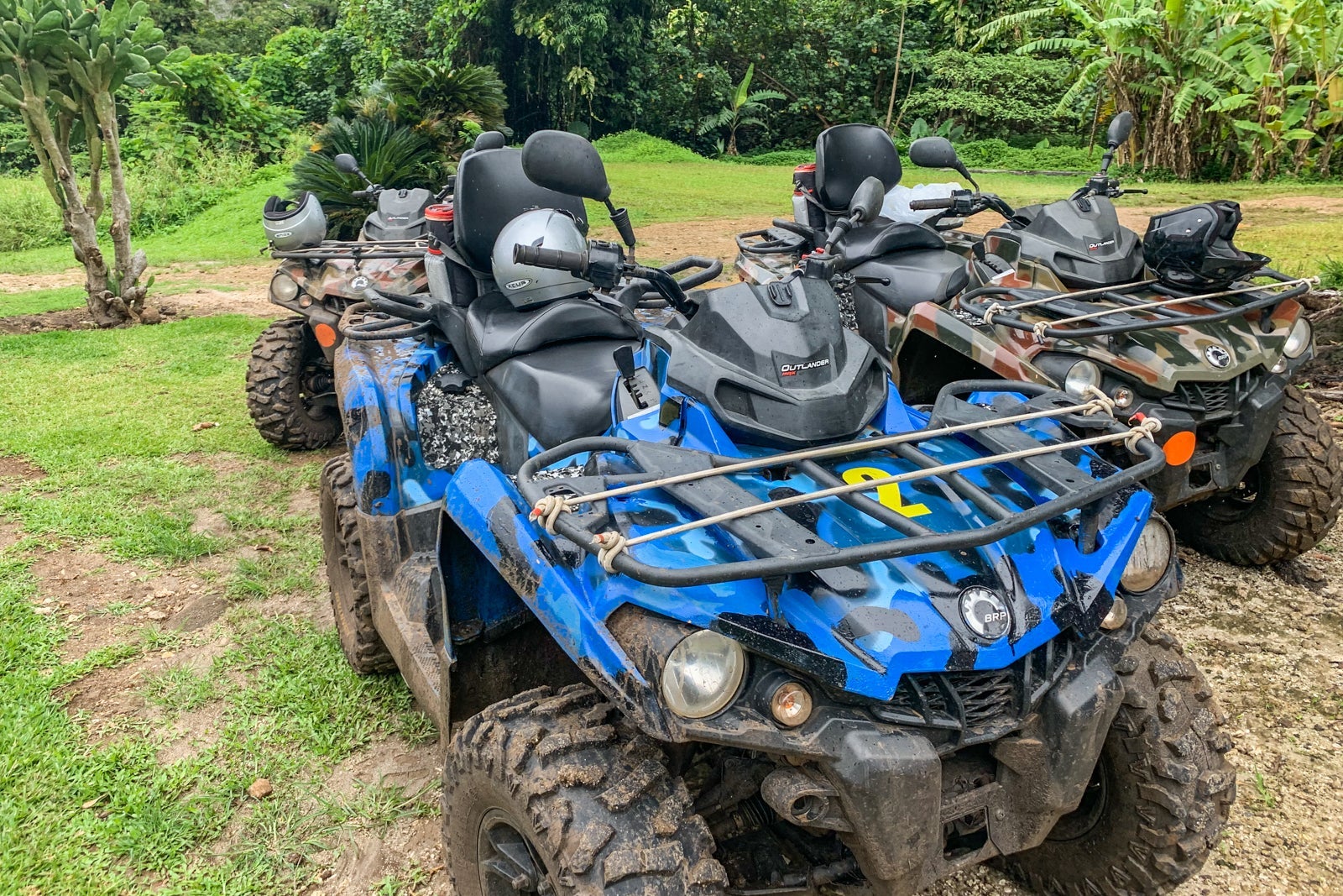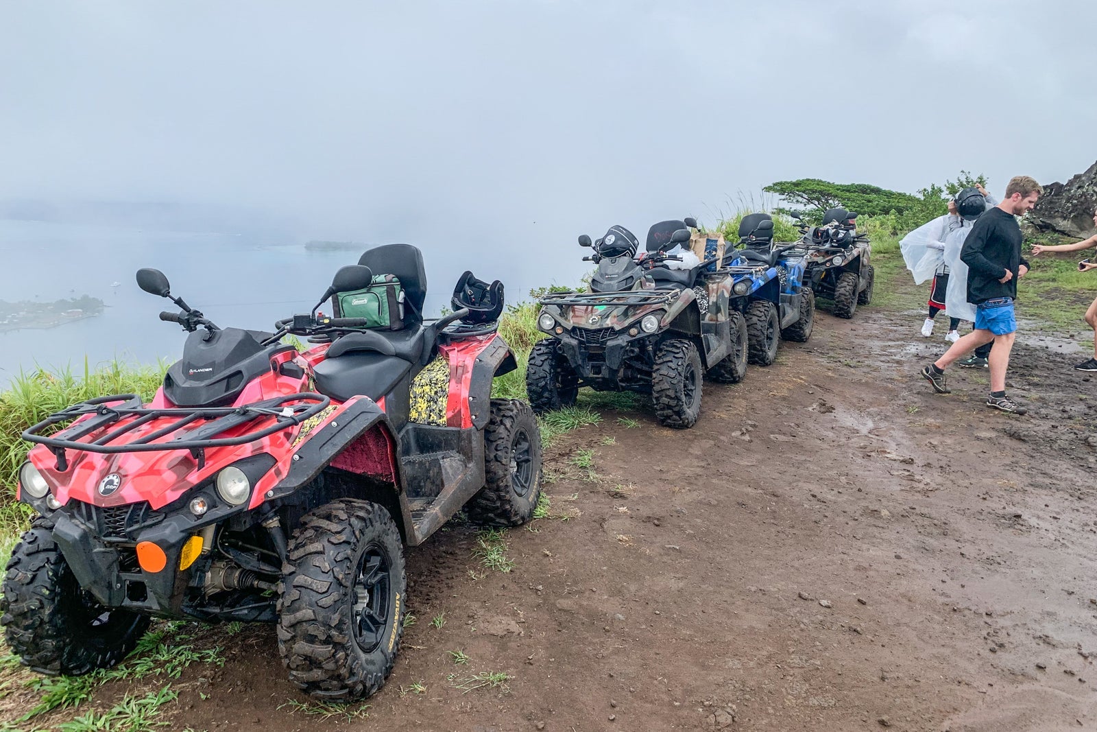 We started our ATV adventure in Vaitape itself, where we caught a glimpse of the town's day-to-day happenings. Once we were suited up for our quad vehicles and given instructions on how to operate them, we followed our guide down a two-lane highway for several miles until we reached a path that took us on a steep climb up Mount Popoti.