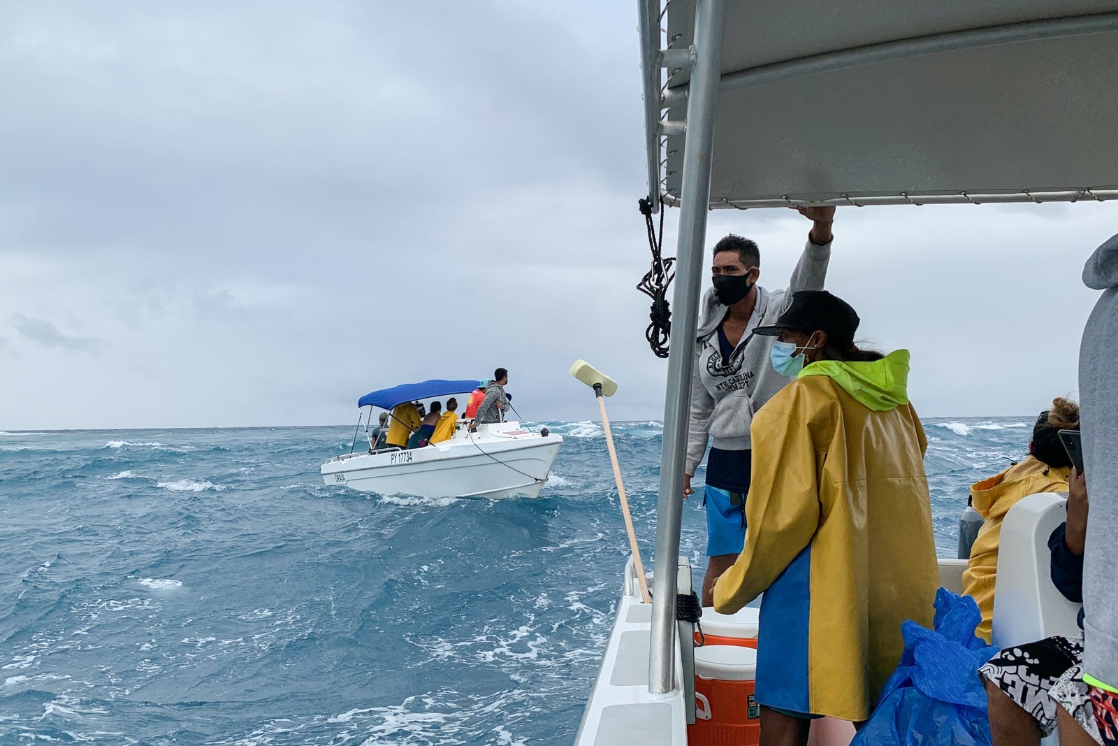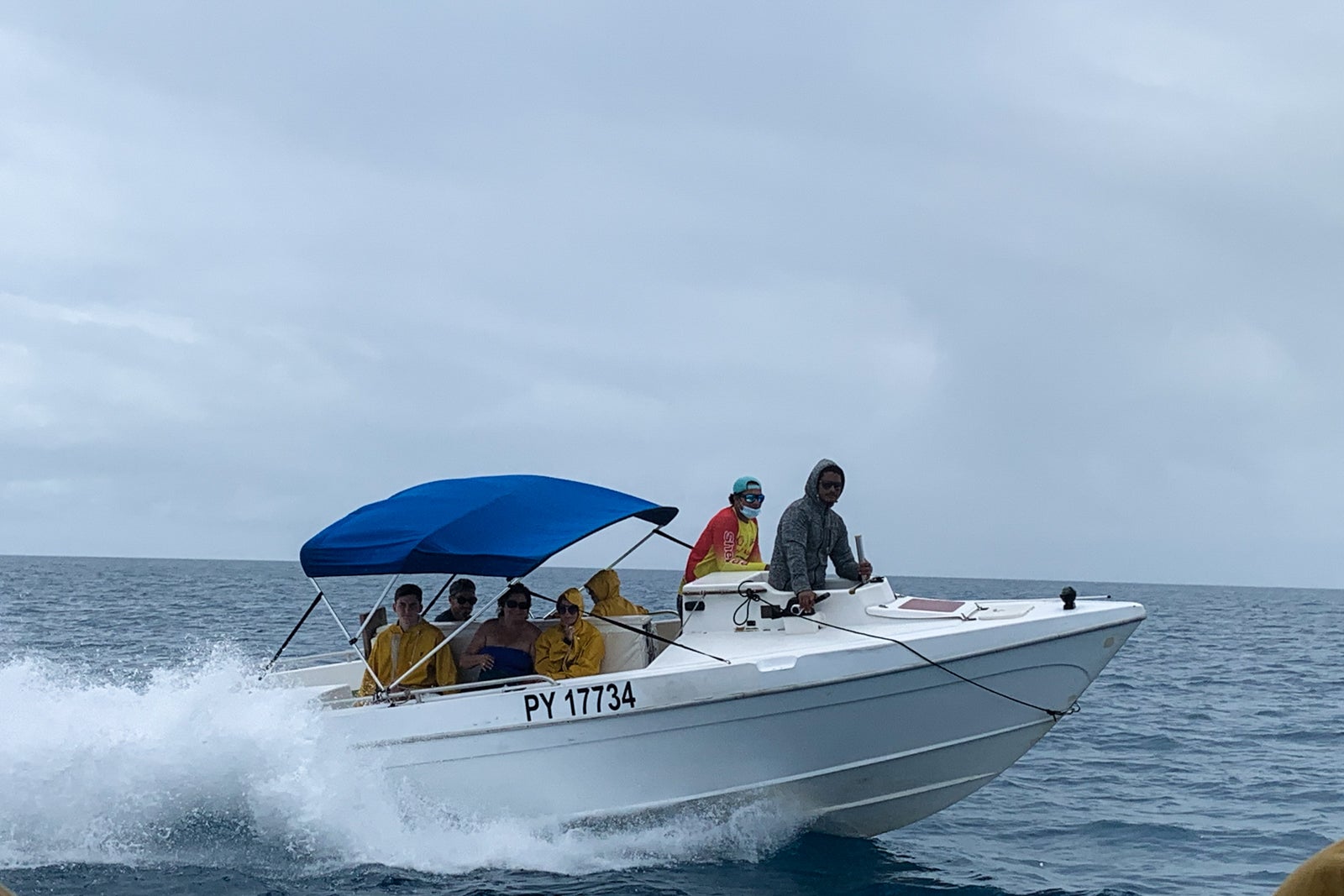 The tour guides picked us up at the resort on a small boat at 9 a.m. We first looked for stingrays and dolphins en route to the Blue Lagoon. Inclement weather prevented us from seeing much at first, but by the time we got to the Blue Lagoon the rain was gone, and we got to do some snorkeling with sharks and stingrays.