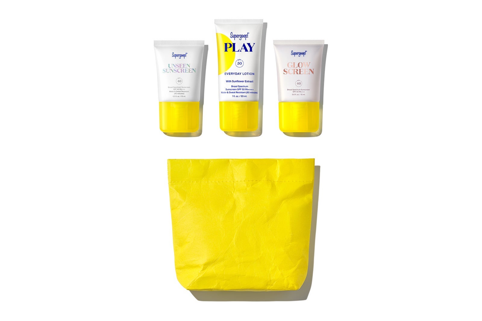 The three-pack comes with Unseen Sunscreen — an invisible, weightless SPF 40 — the Play Everyday lotion, made with sunflower extract complete with SPF 50, and the Glowscreen SPF 40, which can be used as a dewy, brightening, stand-alone sunblock or a makeup primer.