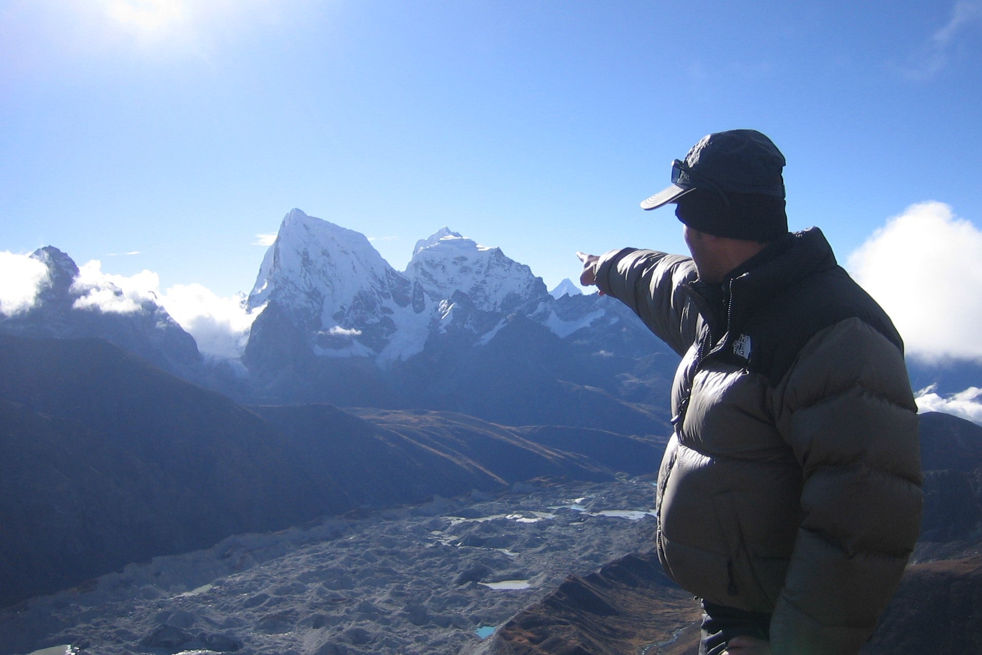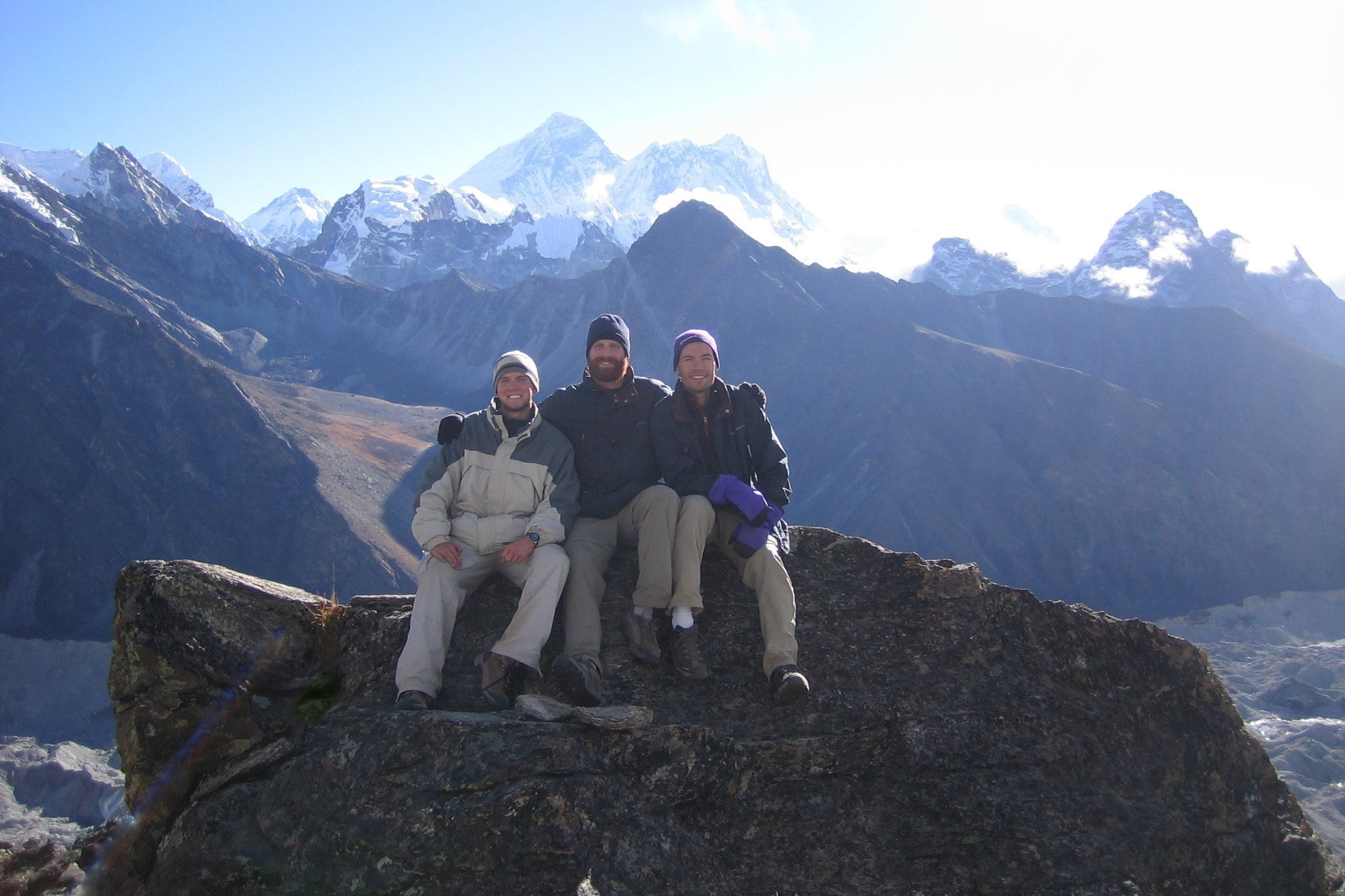 From left: Myself and my friends Aaron and Chris atop Gokyo Ri — 17,575 ft — with Mount Everest looming in the background.