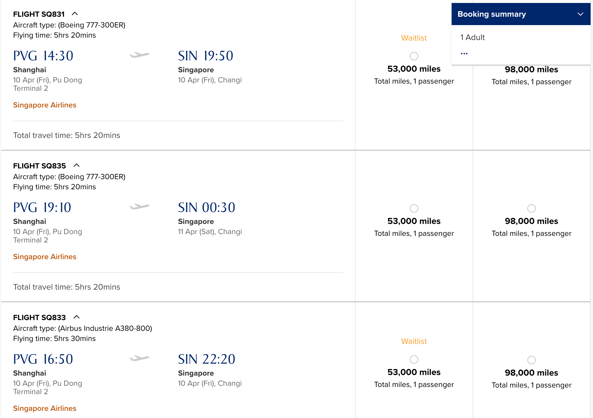 However, remember that Singapore KrisFlyer allows you to waitlist awards; in this case, you'd hold out hope that space opens up before your departure date. This is probably the single most useful attribute of the program. Although you must have enough miles in your account to cover the cost of the award if you want to waitlist, you don't have to book anything automatically if space opens up. If and when it does, you usually have three days to decide whether to book or not, and you can waitlist as many awards as you like without any fees.