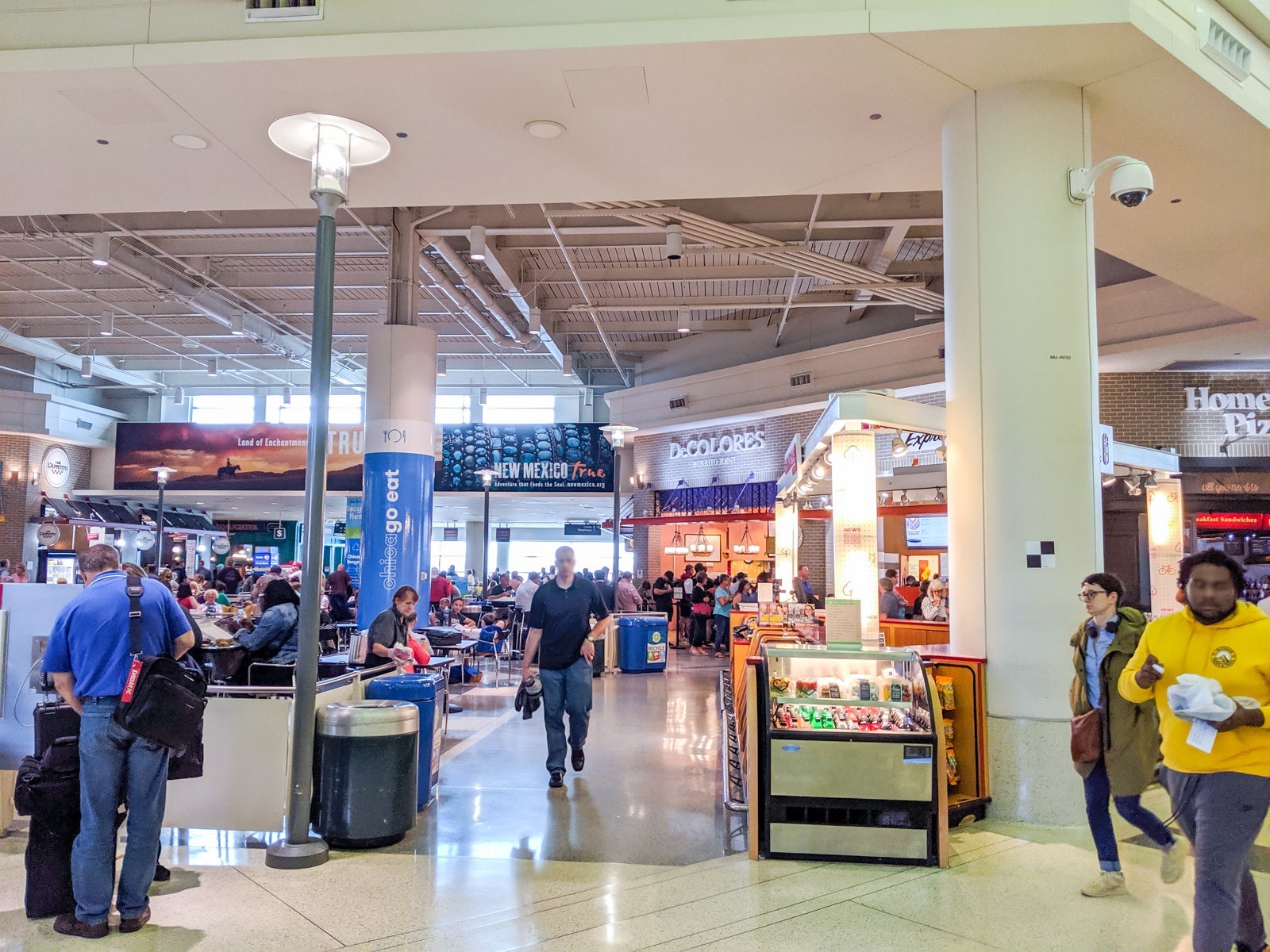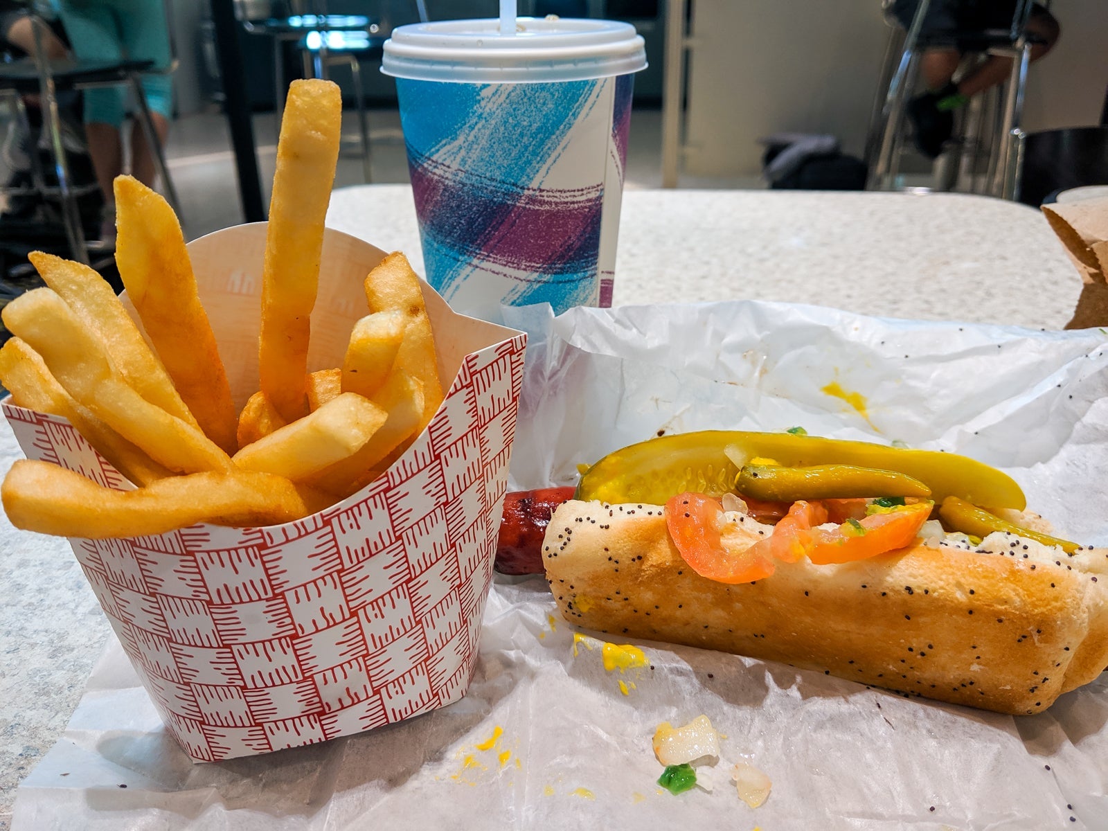 The food court was right past security, and I won't lie to you: It was dreary. Options included Mexican food, pizza, Greek, sushi and a Chicago hot dog joint.