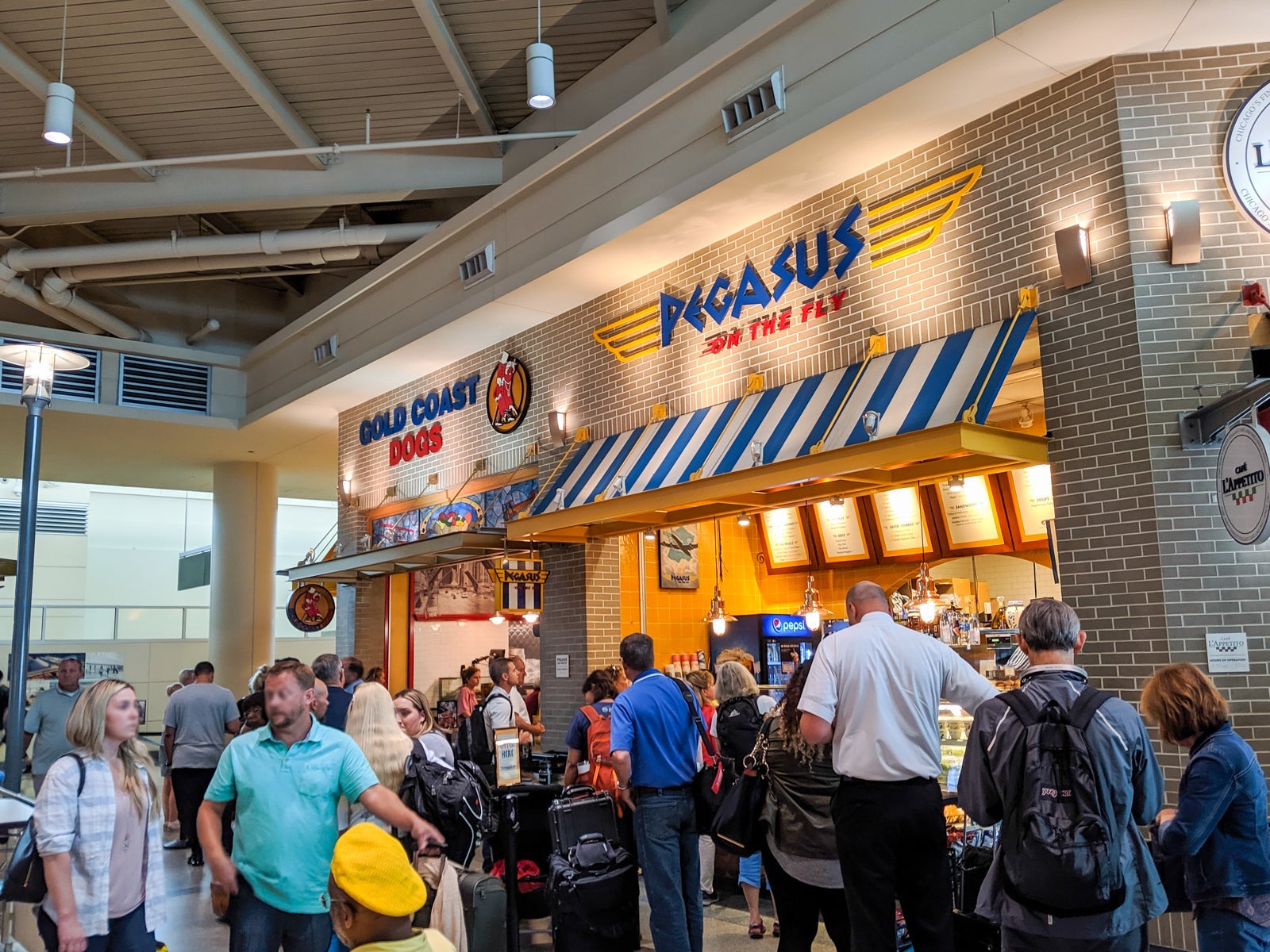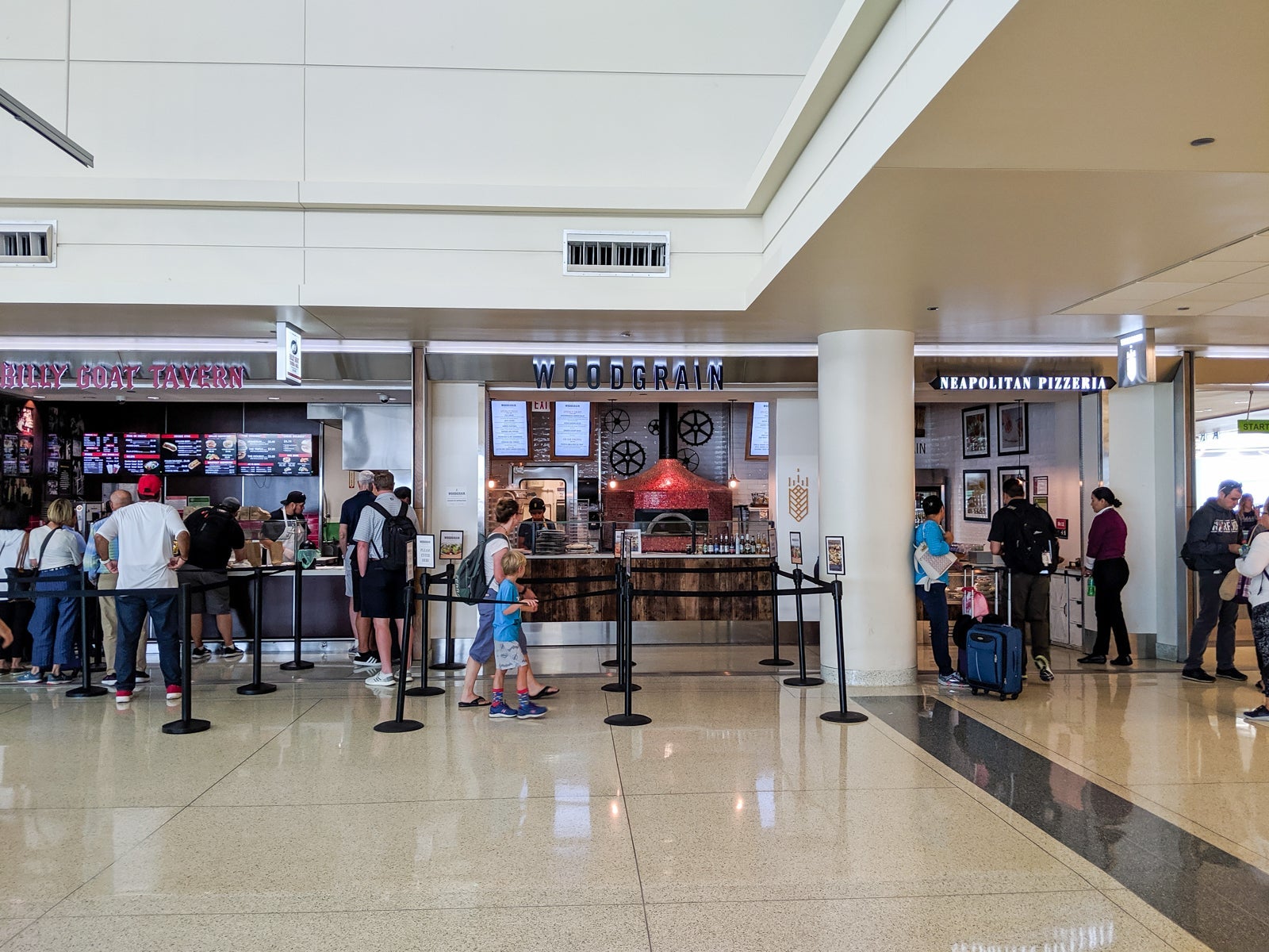 There aren't any lounges here except for a USO lounge, for members of the military and their families only, and the restaurants — including a Pork Chop BBQ, Gold Coast Dogs, Woodgrain Pizza and food court — were bland and boring. You can just imagine how packed the gates were.