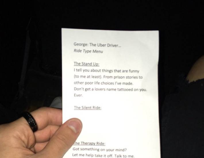 Earlier this month, a radio station shared a viral Tweet featuring a "Ride Type Menu" posted in the back of an Uber. The menu, which is the work of driver George Ure, an Uber driver in the Seattle area, allows riders to choose what type of ride they'd like to have.