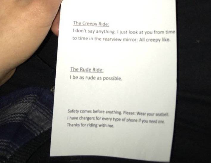 The menu lists five options for passengers, including The Silent Ride, The Stand-Up Ride, The Rude Ride, The Therapy Ride and The Creepy Ride. Descriptions ranged from The Stand Up Ride's "I tell you about things that are funny" to The Creepy Ride's "I don't say anything. I just look at you from time to time in the rearview mirror" to The Rude Ride's straightforward "I be as rude as possible."