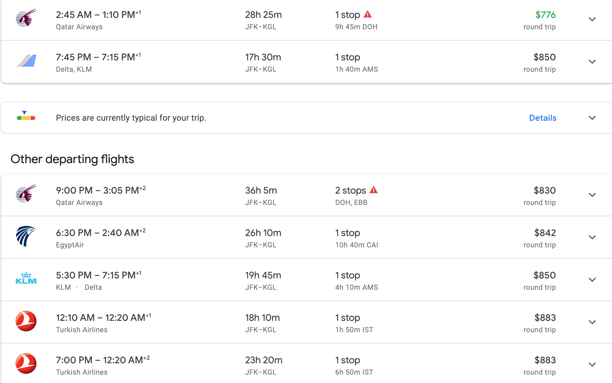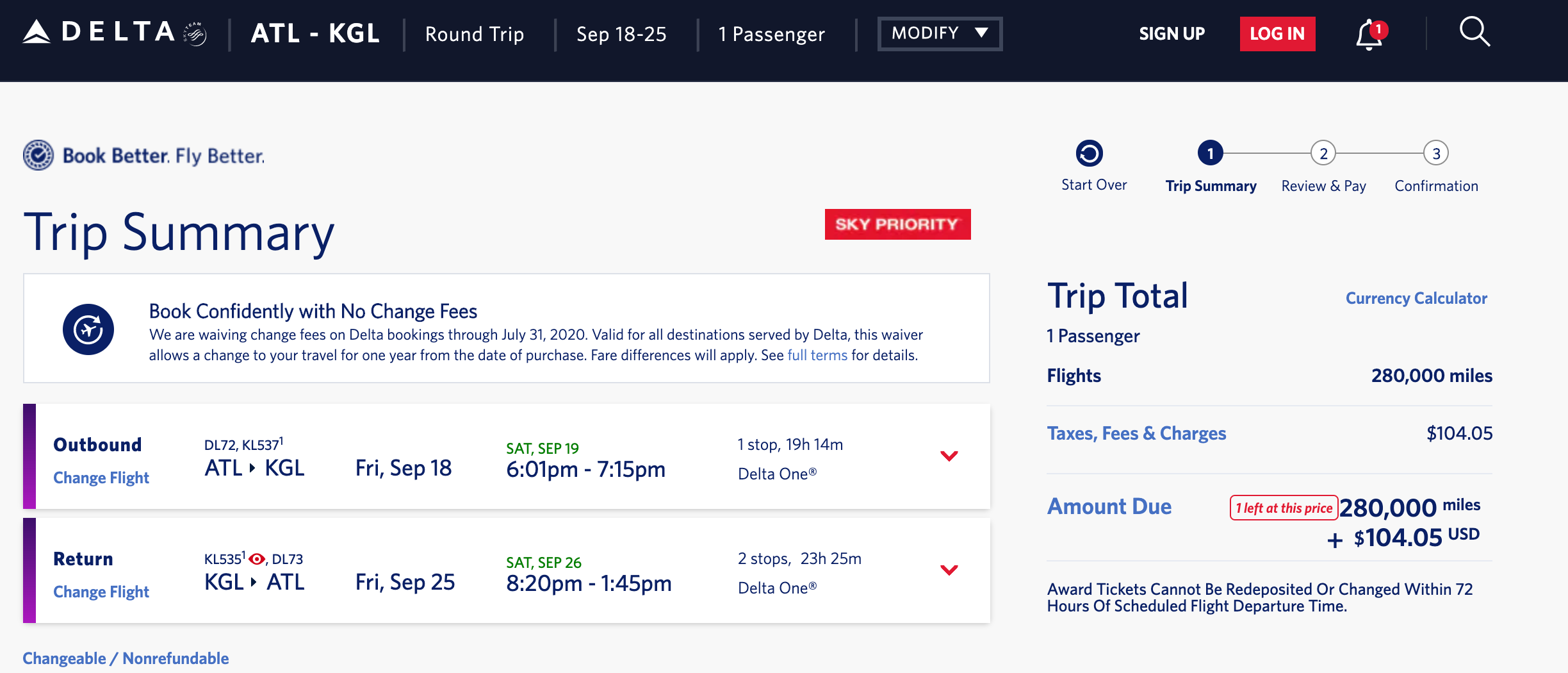 You could also fly KLM booked via Delta, connecting in Amsterdam, for $958 in main cabin, or in Delta One to Amsterdam (the airline's business class) and on to Kigali on KLM for $3,273. The same flights would be 280,000 Delta SkyMiles for business class, plus $104 in taxes and fees.